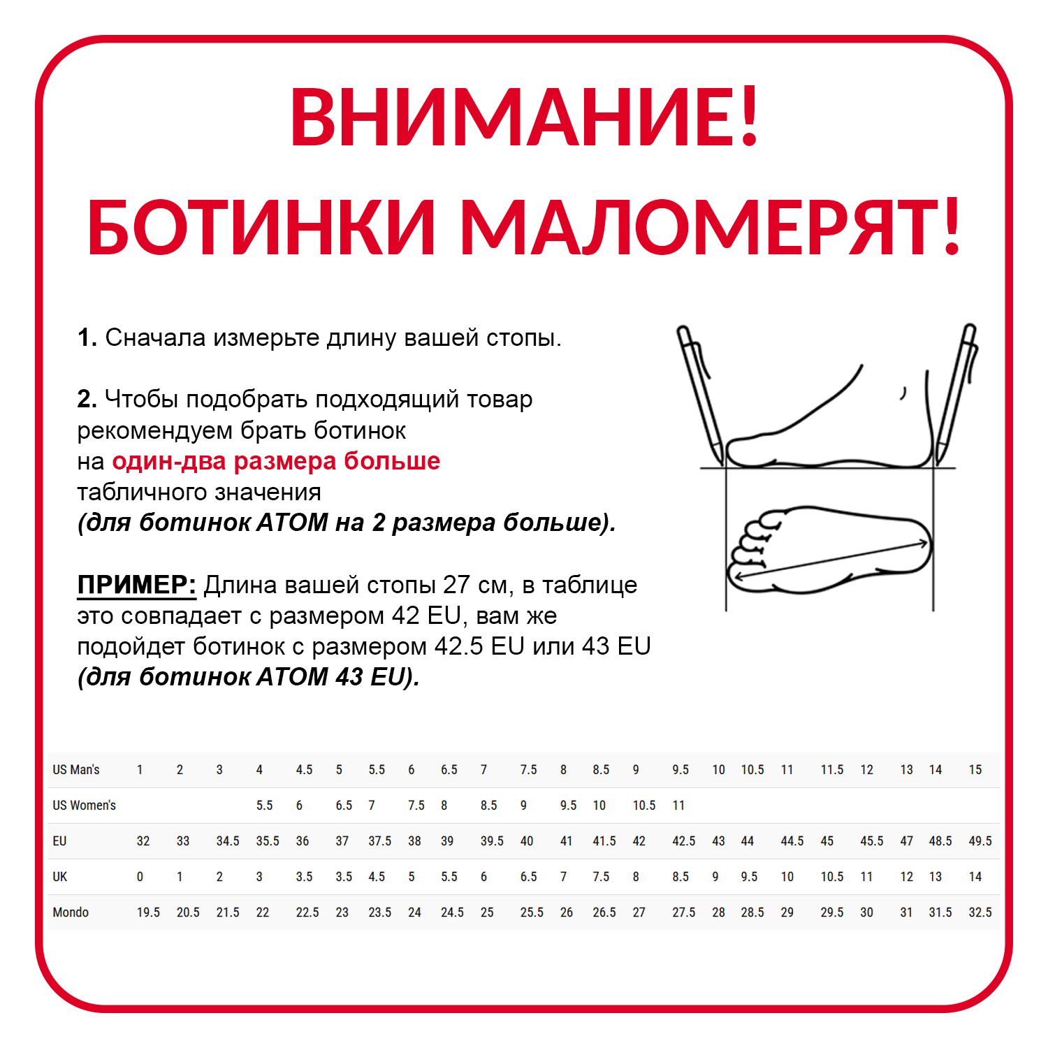 ВНИМАНИЕ! ВАЖНО! Рекомендуем подбирать ботинки исходя из таблицы размеров Atom, представленной ниже, и обращать внимание в первую очередь на строку длины стопы Mondo (значения в сантиметрах). Ботинки маломерят!