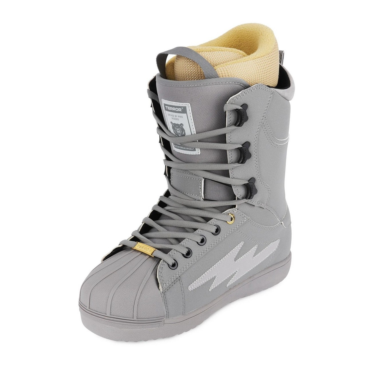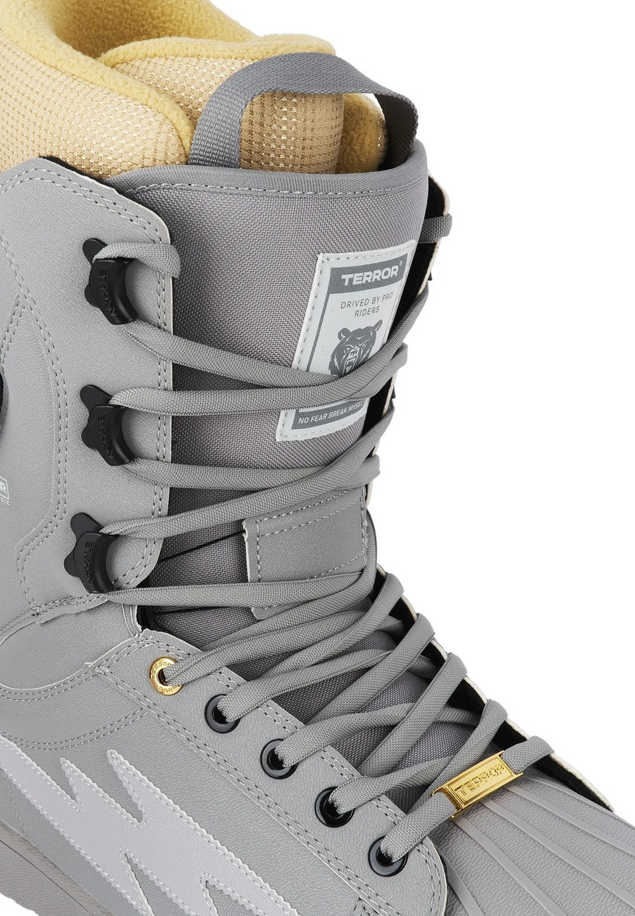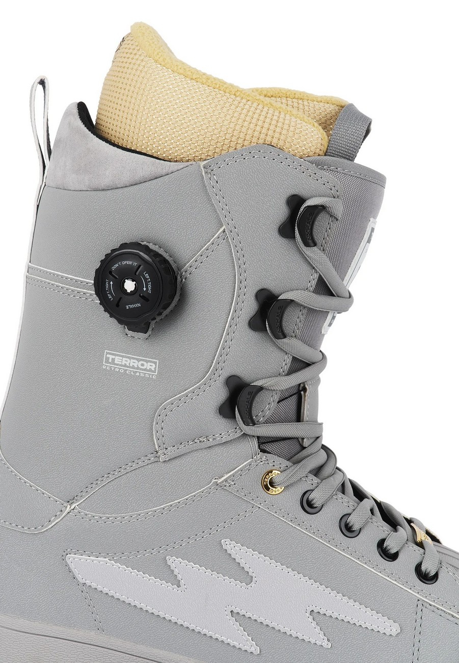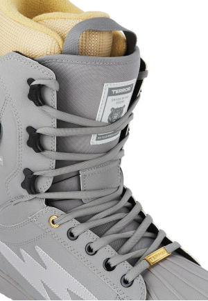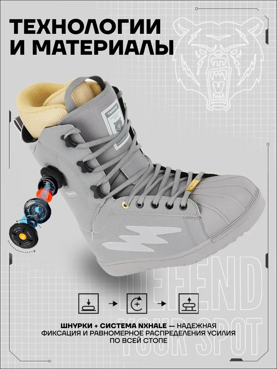 Ботинки Terror Thunder Grey (2026) - это гармония проверенного временем дизайна и передовых технологий для уверенного катания. Средняя жёсткость 5/10 обеспечивает комфорт без ущерба для контроля. Комбинированная система фиксации - классическая шнуровка плюс быстрая система NXHALE - позволяет точно настроить посадку, особенно в области пятки и лодыжки. Формируемый внутренник адаптируется под форму стопы, а демпфирующая подошва и амортизирующая стелька смягчают нагрузку даже при длительных спусках. Идеальный выбор для классического райдера, ценящего надёжность и комфорт.