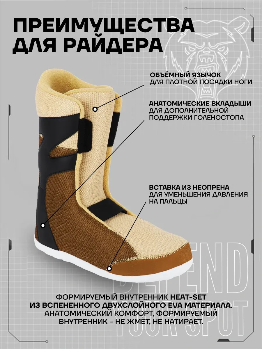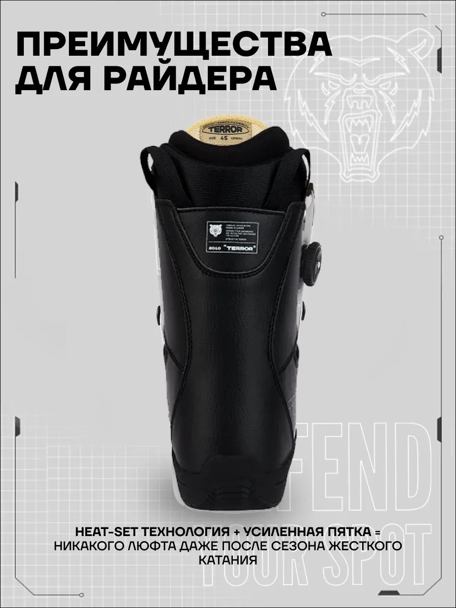 Ботинок должен быть тщательно спроектирован, чтобы выдерживать нагрузки и не ломаться в уязвимых местах. Задняя часть должна быть максимально цельной, без швов и лишних декоративных элементов, так как именно они могут ослабить материалы, что увеличивает риск повреждения по швам. Также следует обратить внимание на общий объем ботинка. В современных топовых моделях часто используются легкие материалы, что помогает сократить вес и объем, а также уменьшить выступание ботинка за край сноуборда.