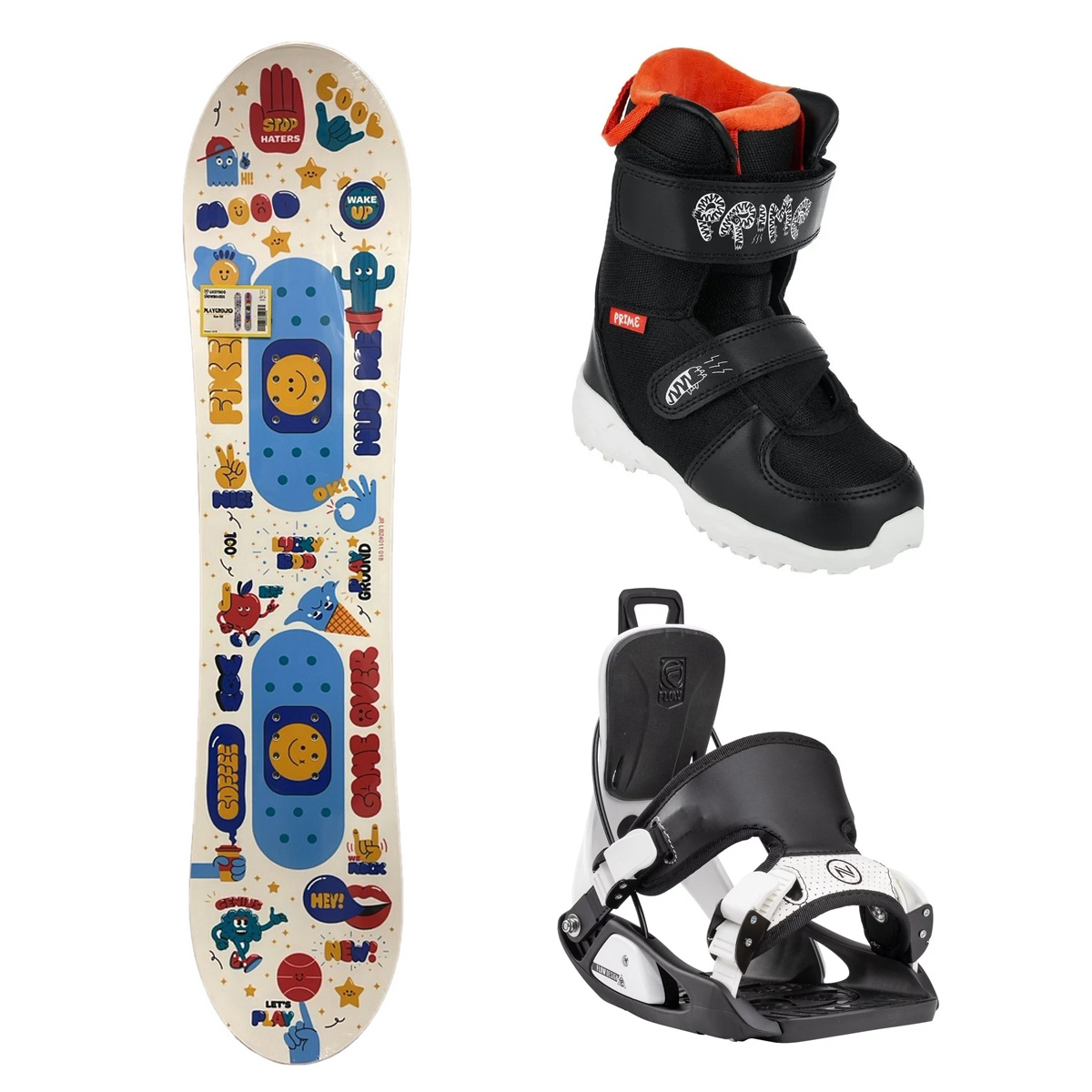 Детский комплект, включающий в себя сноуборд Luckyboo PlayGround (2025), ботинки Prime Play Now Kids Black (2022) и крепления Nidecker Flow Micron Stormtrooper (2025). Приятного катания!