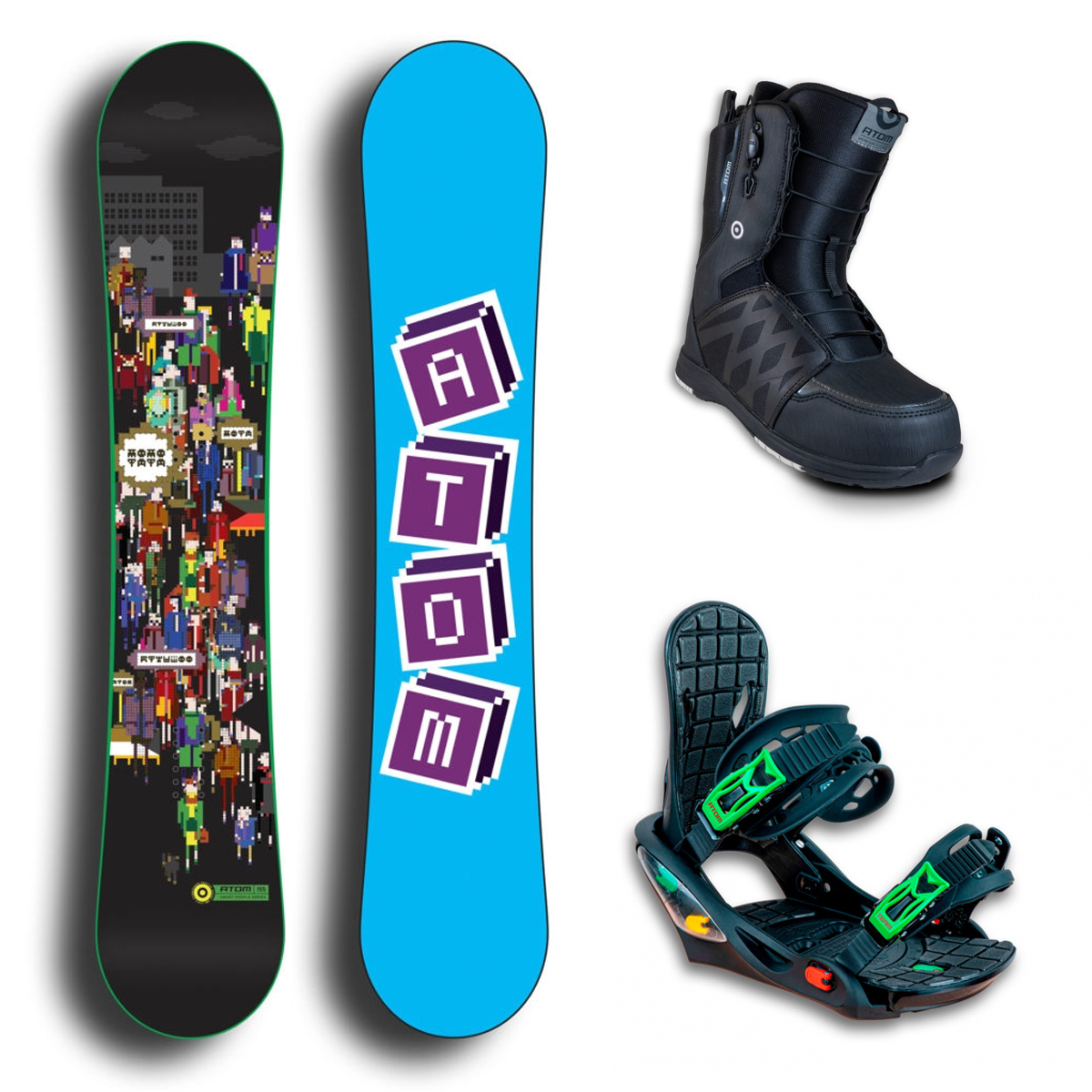 Мужской комплект, включающий в себя сноуборд Atom Smart People (2023), ботинки Atom Team Black/White (2025) и крепления Atom Team Black/Rasta (2021). Приятного катания!