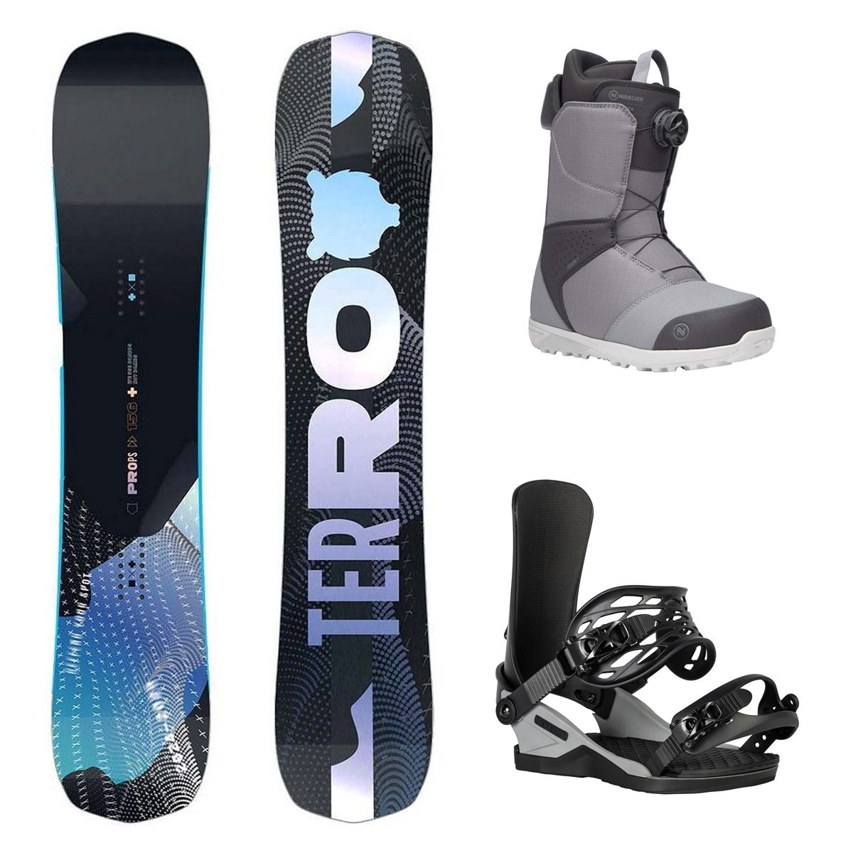 Мужской комплект, включающий в себя сноуборд Terro Props (2025), ботинки Nidecker Sierra Gray (2024) и крепления Reverse Ever Mns Black-Gray (2025). Приятного катания!