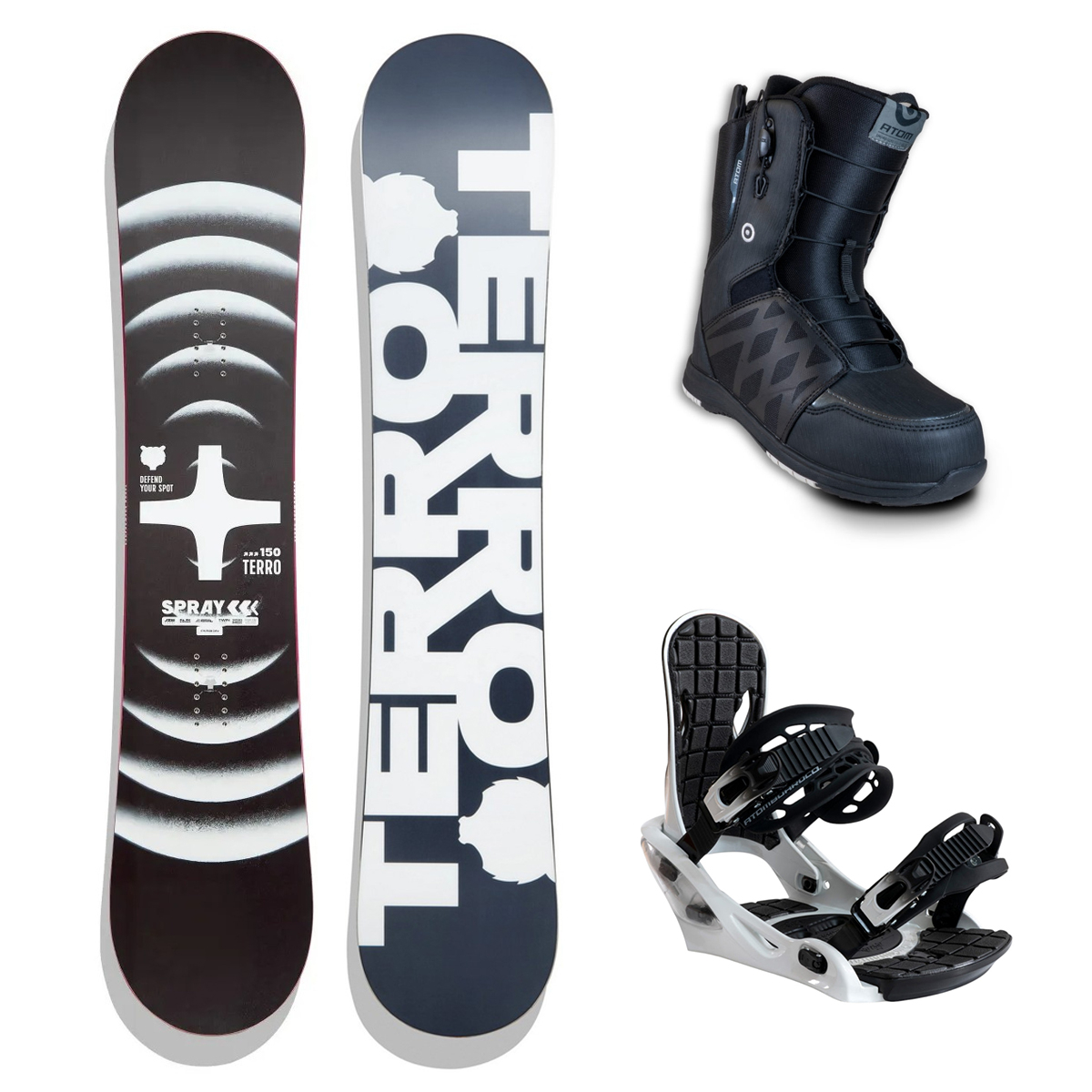 Мужской комплект, включающий в себя сноуборд Terro Spray (2026), ботинки Atom Team Black/White (2025) и крепления Atom Team LTD White/Black Fade (2023). Приятного катания!