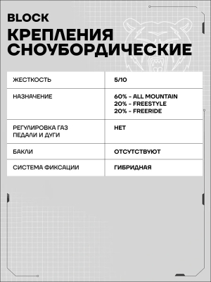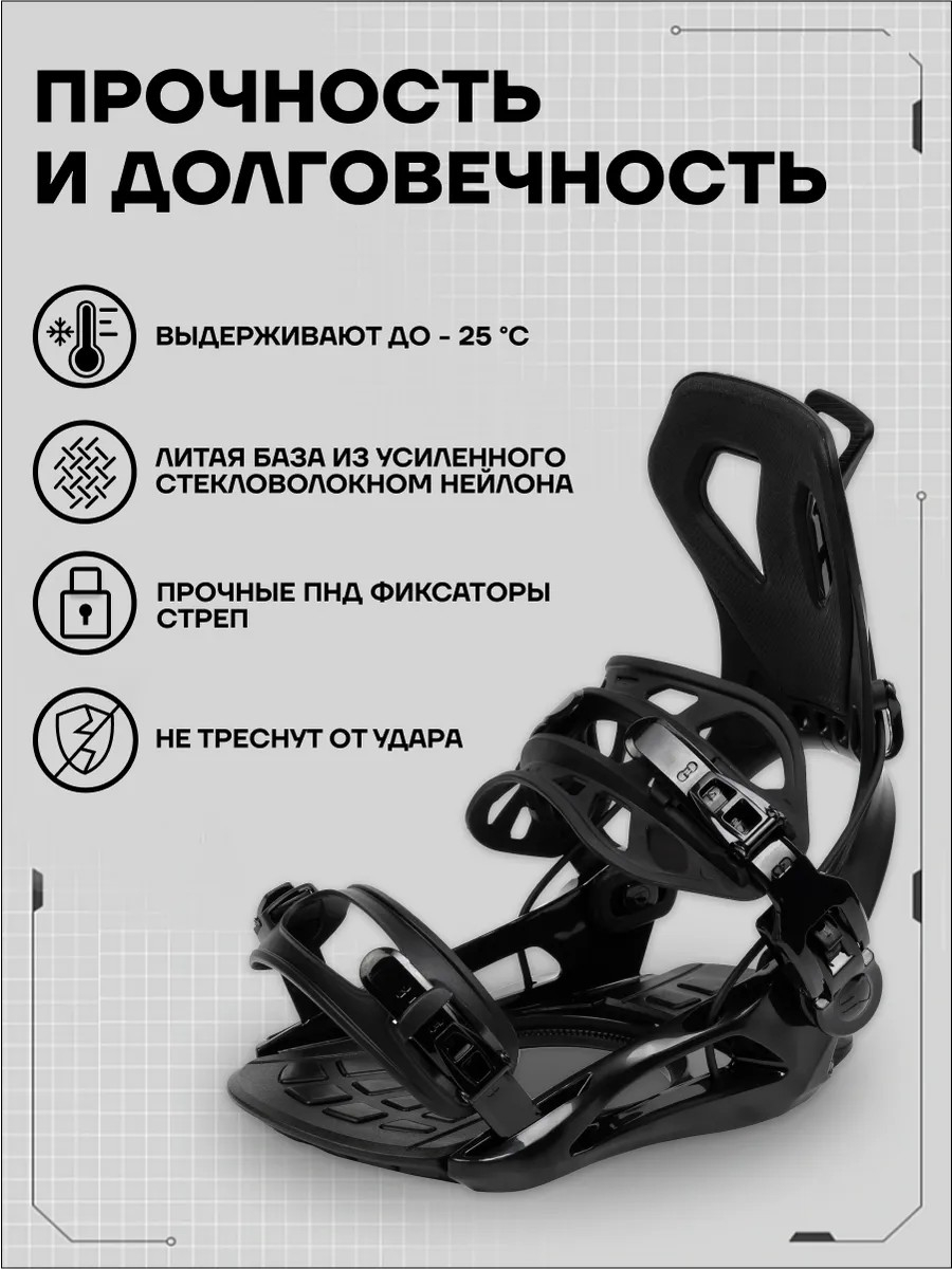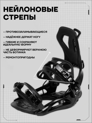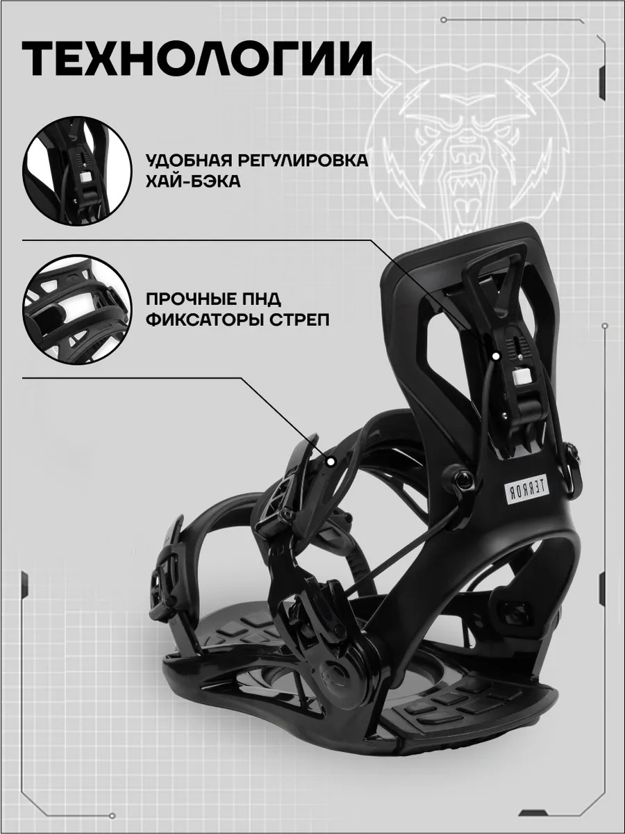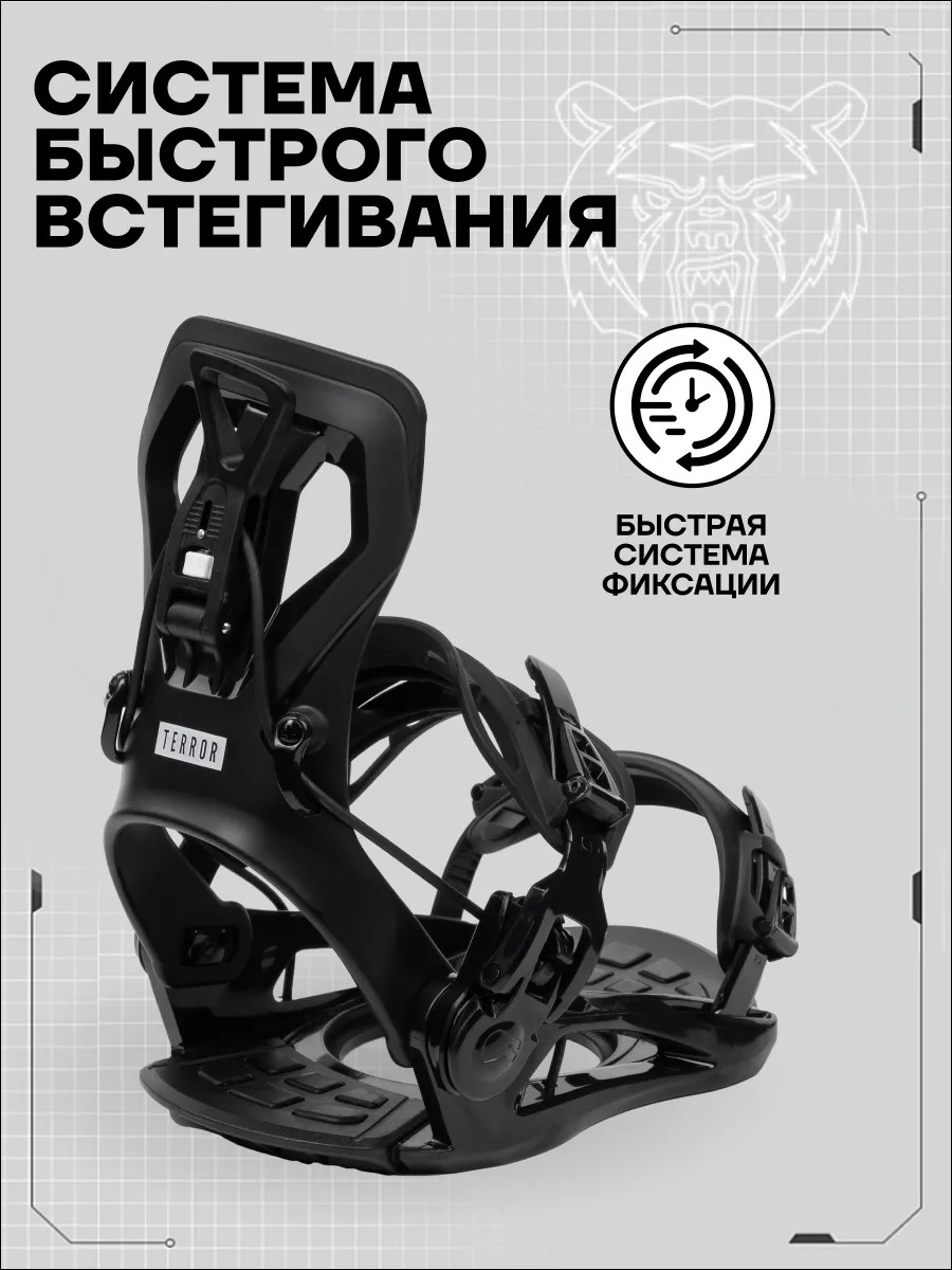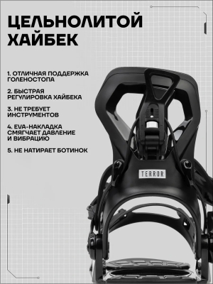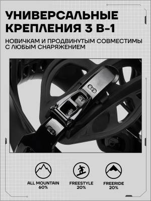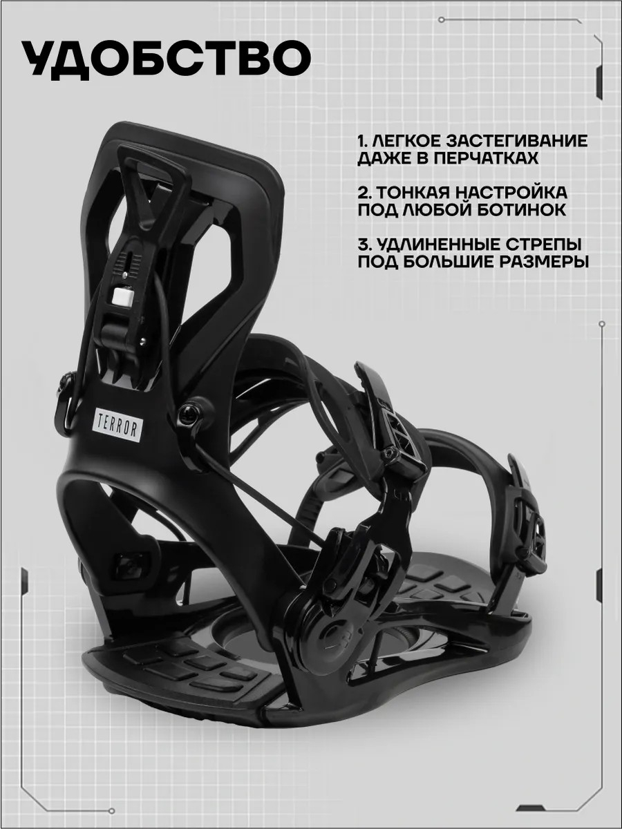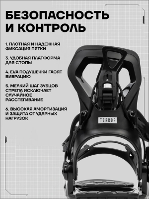 Крепления Terror Only 360 Black созданы для райдеров, которые ценят скорость, комфорт и надёжность. Благодаря системе быстрого встёгивания вы сможете мгновенно готовиться к спуску, не теряя времени. Средняя жёсткость (5/10) обеспечивает отличный баланс между отзывчивостью и амортизацией - идеально для катания в парке и на трассе. Мягкие, но прочные стрепы плотно фиксируют ботинок, а база и хайбэк с EVA-покрытием гасят вибрации и повышают комфорт. Конструкция легко регулируется под любые модели ботинок, исключая зазоры и перегрузки. Универсальный диск совместим с основными стандартами крепления - 4×4 и 3×3.