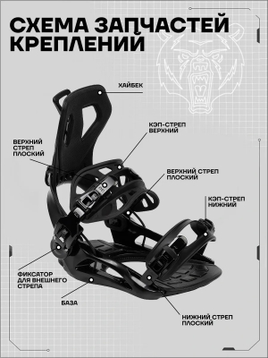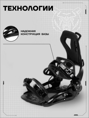 Это основная часть креплений, которая устанавливается на сноуборде и служит местом для ног райдера. От базы требуется быть прочной и, по возможности, легкой. Поломать качественно изготовленную базу очень трудно. Именно поэтому некоторые производители, такие как Burton и Union, предоставляют на нее пожизненную гарантию, если отсутствуют внешние повреждения — такие как сколы или заусенцы. База креплений может быть цельной или иметь регулируемую пяточную дугу. Важным элементом базы сноубордических креплений являются амортизирующие вставки, изготовленные из различных полимерных материалов — таких как вспененная резина, EVA или гель. Они необходимы для любителей прыжков в парке, а также для фрирайдеров, предпочитающих высокие дропы.