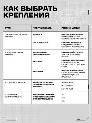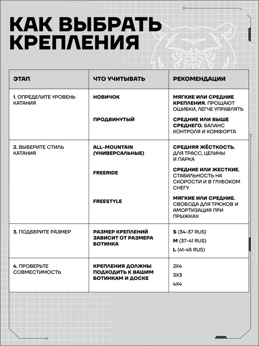 Жесткость креплений. Под жесткостью сноубордического крепления подразумевается жесткость трех его основных элементов: жесткость базы, жесткость хайбэка и жесткость верхнего стрепа. Из этого складывается понимание в каком стиле и на каких склонах предпочтительней использовать конкретную модель.
