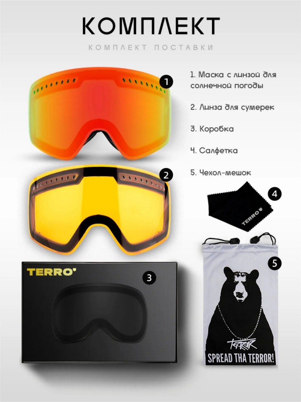 Маска Terro Defender Golden - это высокотехнологичная защита для глаз с эффектной безрамочной конструкцией и широким углом зрения. В комплект входят две магнитные линзы, оптимизированные под разные условия: пасмурную погоду, горные условия и сумерки. Обе обеспечивают полную защиту от УФ-излучения, а благодаря двойной конструкции и вентиляционным отверстиям в верхней части эффективно сопротивляются запотеванию. Линзы имеют антибликовое покрытие, устойчивое к царапинам и механическим повреждениям. Внутренняя часть маски оснащена двойным поролоновым слоем с мягкой флисовой накладкой для комфортного прилегания. Эластичный ремень легко регулируется под любой шлем, а силиконовая полоска на изнанке предотвращает сползание. Модель совместима с корректирующими очками.