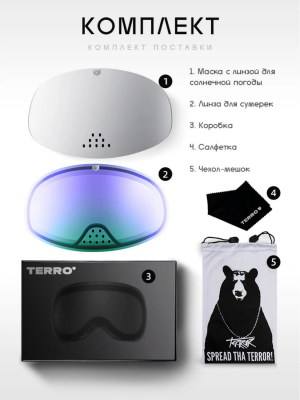 Маска Terro Future - смелый шаг в будущее горнолыжного дизайна и функциональности. Её инновационная конструкция с вентиляционными отверстиями прямо в линзе обеспечивает превосходную циркуляцию воздуха, предотвращая запотевание и позволяя легко дышать даже при интенсивной нагрузке. При этом маска надёжно защищает от ледяного ветра, снега и влаги. В комплекте идут две двойные магнитные линзы - для гор (VLT 24%) и пасмурной погоды (VLT 74%), каждая с антибликовым, устойчивым к царапинам покрытием и 100% защитой от УФ-излучения. Мягкая внутренняя подкладка из двойного поролона и микрофибры, эластичный ремень с силиконовой полосой и возможностью регулировки обеспечивают комфортную посадку и совместимость с очками для зрения. Маска идеально сочетается с шлемами Terro, создавая единый, аэродинамичный ансамбль.