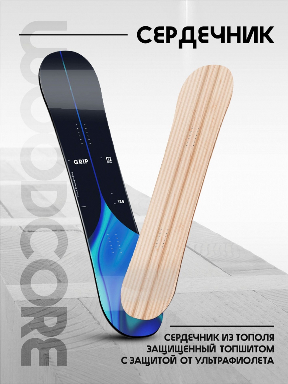 Традиционно его делают из дерева. Существует несколько видов деревянных сердечников. Реже всего встречающийся вид сердечника, «сплошной» (изготовленный из одного куска дерева), имеет один очень существенный недостаток - его может «повести винтом». Такие дешевые и легкие сердечники используют в сноубордах начального уровня. Дабы избежать винтового скручивания, чаще всего делают сердечник «с вертикальным ламинатом». Он состоит из продольных реек, склеенных между собой. Волокна в таком сердечнике противоположно направлены, именно для предотвращения «скручивания». Часто для сердечников используют рейки из разных пород дерева - как хвойных, так и лиственных.