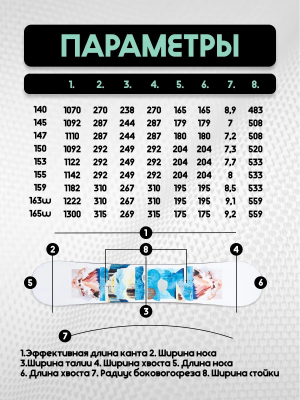 Геометрия определяется рядом характеристик: Ростовка - это длина доски от ее носа до хвоста. Как правило, соотношение веса райдера и рекомендуемой ростовки указано в таблицах описания моделей. Ширина носа и хвоста - это расстояние между самыми удаленными друг от друга точками, носа и хвоста, соответственно. Обычно эти два показателя определяют симметрию или асимметрию сноуборда. Ширина талии - это расстояния между ближайшими точками боковых поверхностей доски. Эффективная длина канта - это та часть канта доски, которая касается склона при движении и поворотах. Радиус бокового выреза - это радиус воображаемой окружности, часть которой проходит по боковой части канта доски.