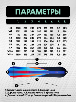 Геометрия определяется рядом характеристик: Ростовка - это длина доски от ее носа до хвоста. Как правило, соотношение веса райдера и рекомендуемой ростовки указано в таблицах описания моделей. Ширина носа и хвоста - это расстояние между самыми удаленными друг от друга точками, носа и хвоста, соответственно. Обычно эти два показателя определяют симметрию или асимметрию сноуборда. Ширина талии - это расстояния между ближайшими точками боковых поверхностей доски. Эффективная длина канта - это та часть канта доски, которая касается склона при движении и поворотах. Радиус бокового выреза - это радиус воображаемой окружности, часть которой проходит по боковой части канта доски.