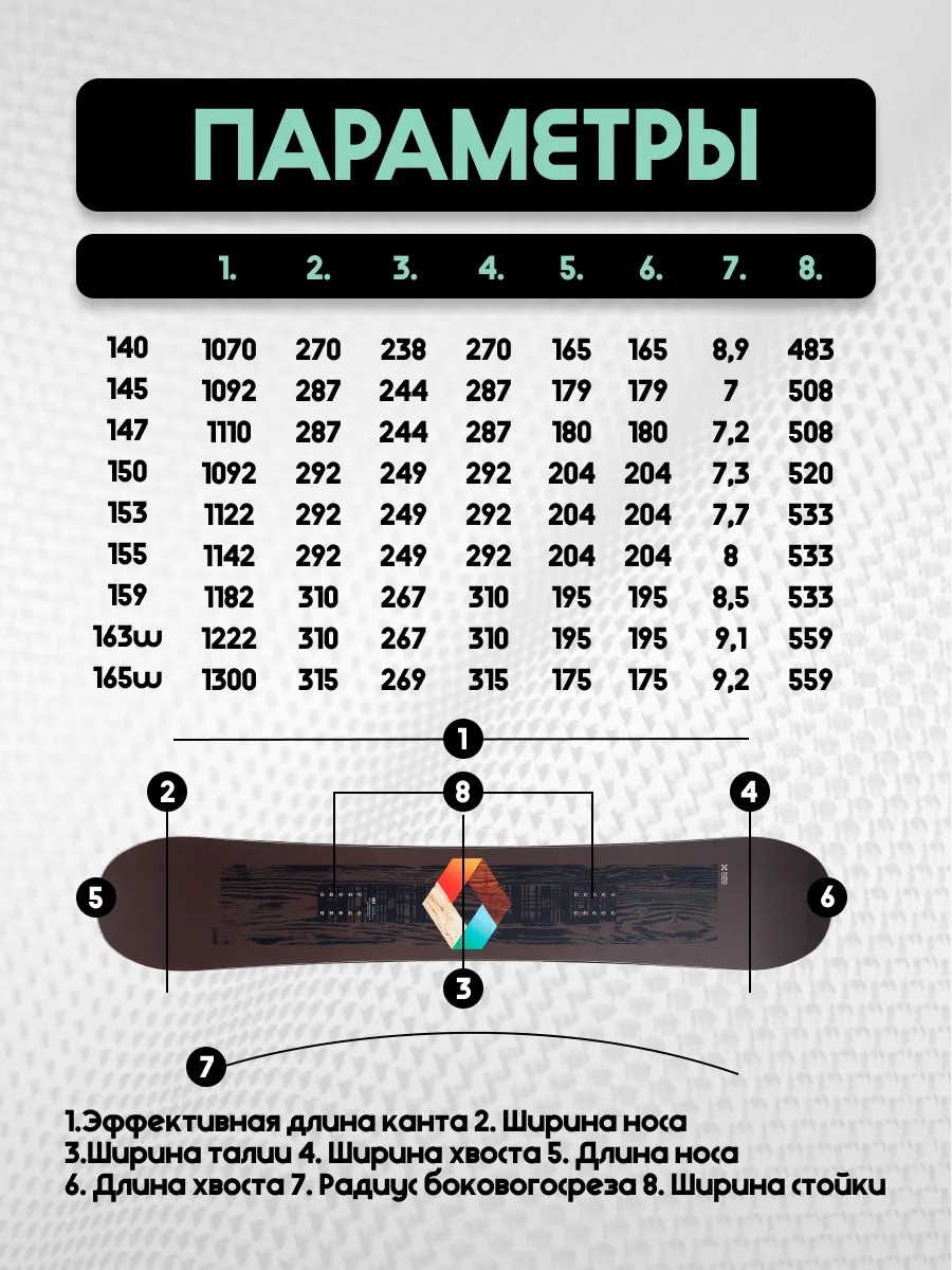 Геометрия определяется рядом характеристик: Ростовка - это длина доски от ее носа до хвоста. Как правило, соотношение веса райдера и рекомендуемой ростовки указано в таблицах описания моделей. Ширина носа и хвоста - это расстояние между самыми удаленными друг от друга точками, носа и хвоста, соответственно. Обычно эти два показателя определяют симметрию или асимметрию сноуборда. Ширина талии - это расстояния между ближайшими точками боковых поверхностей доски. Эффективная длина канта - это та часть канта доски, которая касается склона при движении и поворотах. Радиус бокового выреза - это радиус воображаемой окружности, часть которой проходит по боковой части канта доски.