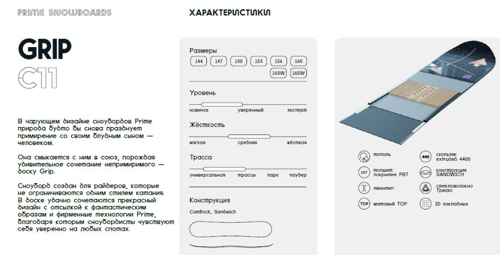 В сноуборде Grip от Prime природа словно вновь находит общий язык с человеком - своим некогда «блудным сыном» - и в этом гармоничном союзе рождается нечто по-настоящему уникальное. Эта доска создана для универсальных райдеров, которые не хотят выбирать между стилями катания. Её вдохновляющий дизайн, наполненный фантастическими мотивами, гармонично сочетается с передовыми технологиями Prime, обеспечивая уверенность, контроль и комфорт на любом склоне - будь то парк, трасса или целина.
