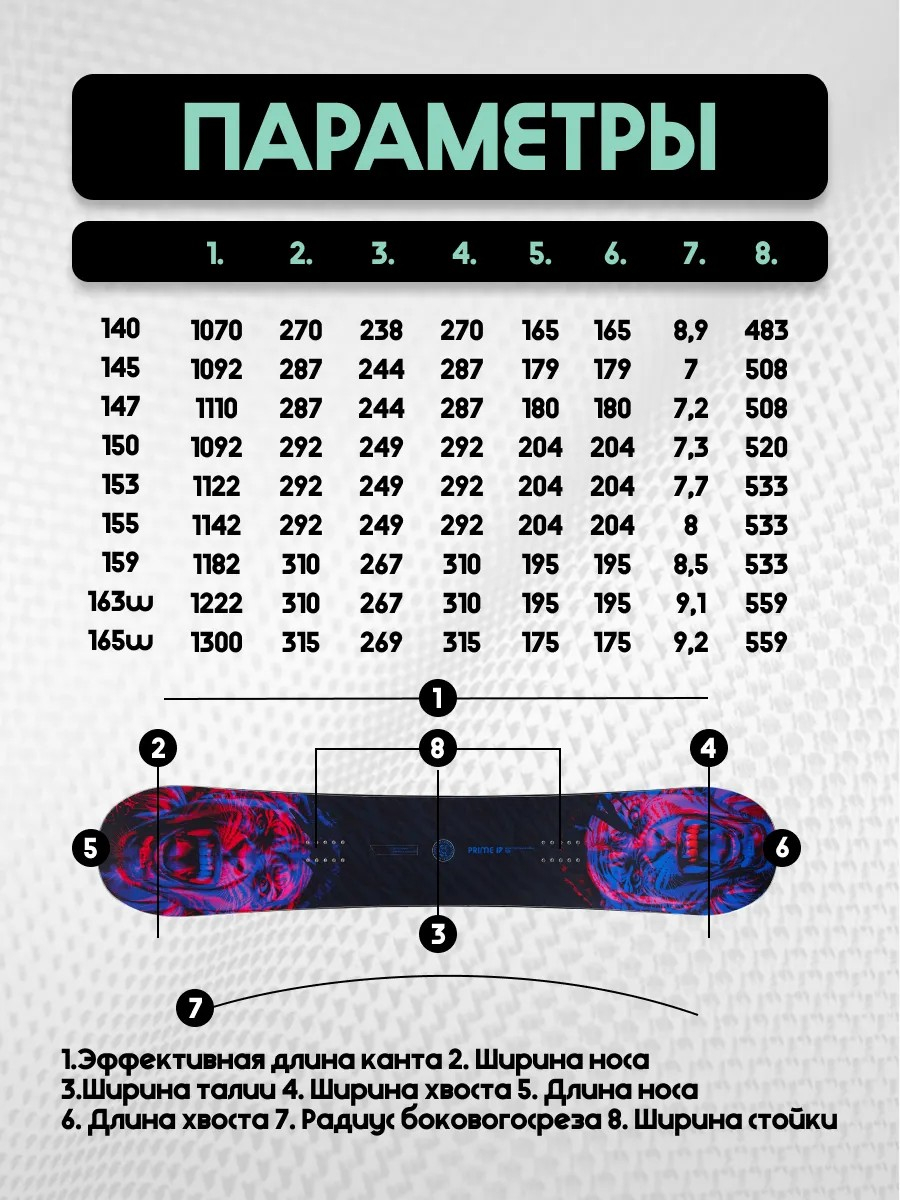 Геометрия определяется рядом характеристик: Ростовка - это длина доски от ее носа до хвоста. Как правило, соотношение веса райдера и рекомендуемой ростовки указано в таблицах описания моделей. Ширина носа и хвоста - это расстояние между самыми удаленными друг от друга точками, носа и хвоста, соответственно. Обычно эти два показателя определяют симметрию или асимметрию сноуборда. Ширина талии - это расстояния между ближайшими точками боковых поверхностей доски. Эффективная длина канта - это та часть канта доски, которая касается склона при движении и поворотах. Радиус бокового выреза - это радиус воображаемой окружности, часть которой проходит по боковой части канта доски.