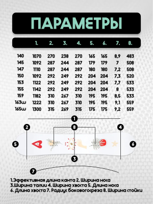 Геометрия определяется рядом характеристик: Ростовка - это длина доски от ее носа до хвоста. Как правило, соотношение веса райдера и рекомендуемой ростовки указано в таблицах описания моделей. Ширина носа и хвоста - это расстояние между самыми удаленными друг от друга точками, носа и хвоста, соответственно. Обычно эти два показателя определяют симметрию или асимметрию сноуборда. Ширина талии - это расстояния между ближайшими точками боковых поверхностей доски. Эффективная длина канта - это та часть канта доски, которая касается склона при движении и поворотах. Радиус бокового выреза - это радиус воображаемой окружности, часть которой проходит по боковой части канта доски.