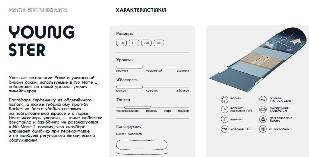 Сноуборд Youngster выводит катание подростков на новый уровень благодаря передовым технологиям Prime и выразительному дизайну. Лёгкий тополевый сердечник в сочетании с гибридным прогибом Classic CamRock обеспечивает комфорт и контроль как на ухоженных курортных трассах, так и в парке. Инженеры Prime специально продумали эту модель для начинающих фристайлеров и поклонников джиббинга: доска мягко сглаживает ошибки при перекантовке и при этом не нуждается в частом техническом обслуживании. Youngster - надёжный спутник юного райдера в богатом на события мире сноубординга.