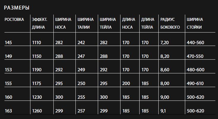 Геометрия определяется рядом характеристик: Ростовка - это длина доски от ее носа до хвоста. Как правило, соотношение веса райдера и рекомендуемой ростовки указано в таблицах описания моделей. Ширина носа и хвоста - это расстояние между самыми удаленными друг от друга точками, носа и хвоста, соответственно. Обычно эти два показателя определяют симметрию или асимметрию сноуборда. Ширина талии - это расстояния между ближайшими точками боковых поверхностей доски. Эффективная длина канта - это та часть канта доски, которая касается склона при движении и поворотах. Радиус бокового выреза - это радиус воображаемой окружности, часть которой проходит по боковой части канта доски.