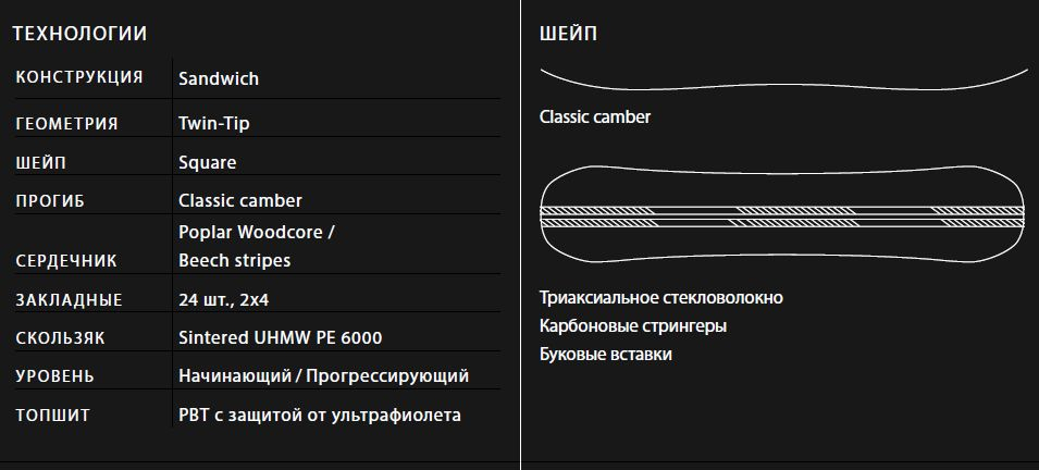 Классический Camber с изогнутой кверху центральной частью подойдет для универсального катания. Его также выделяют за щелчок, поэтому Camber подходит для прыжков с кикеров.