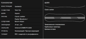 QuadAxial (четырехслойная). Стеклоткань размещена под углами 45/0/90/45, что обеспечивает доске максимальную жесткость и оптимальную передачу веса на кант. Этот материал преимущественно используется в сноубордах, предназначенных для жестких ботинок, и очень редко встречается в моделях для обычной обуви.
