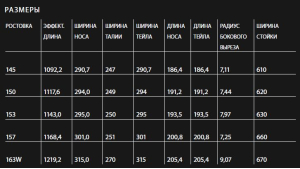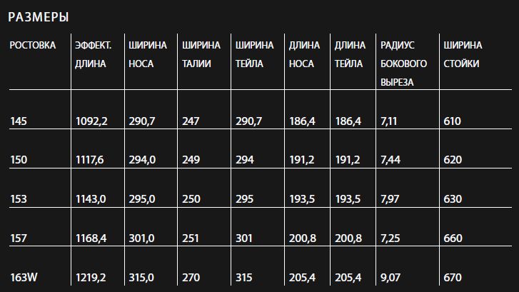Геометрия определяется рядом характеристик: Ростовка - это длина доски от ее носа до хвоста. Как правило, соотношение веса райдера и рекомендуемой ростовки указано в таблицах описания моделей. Ширина носа и хвоста - это расстояние между самыми удаленными друг от друга точками, носа и хвоста, соответственно. Обычно эти два показателя определяют симметрию или асимметрию сноуборда. Ширина талии - это расстояния между ближайшими точками боковых поверхностей доски. Эффективная длина канта - это та часть канта доски, которая касается склона при движении и поворотах. Радиус бокового выреза - это радиус воображаемой окружности, часть которой проходит по боковой части канта доски.