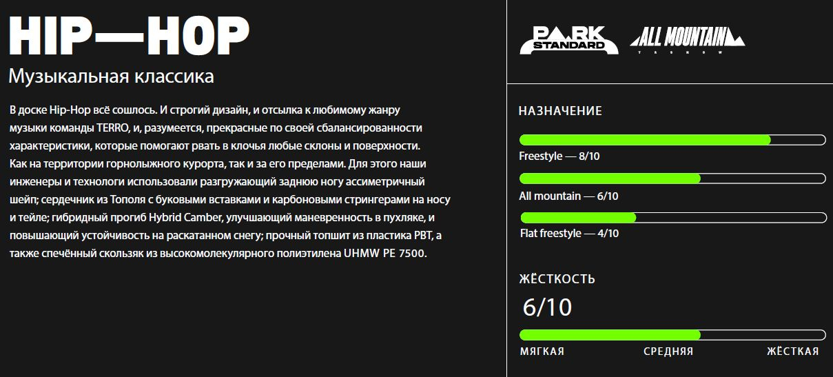 В сноуборде Hip-Hop всё идеально сочетается: лаконичный дизайн, дань уважения любимому музыкальному жанру команды Terro и выверенные, сбалансированные характеристики, которые позволяют уверенно «разрывать» любые склоны - как внутри курорта, так и в дикой целине. Чтобы добиться такого результата, инженеры и технологи Terro оснастили доску асимметричным шейпом, снижающим нагрузку на заднюю ногу, сердечником из тополя с буковыми вставками и карбоновыми стрингерами на носу и хвосте для мощного отклика и прочности, а также гибридным прогибом Hybrid Camber, который обеспечивает отличную управляемость в пухляке и стабильность на укатанном снегу.