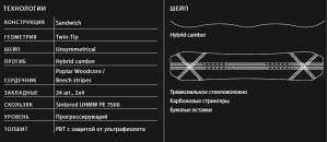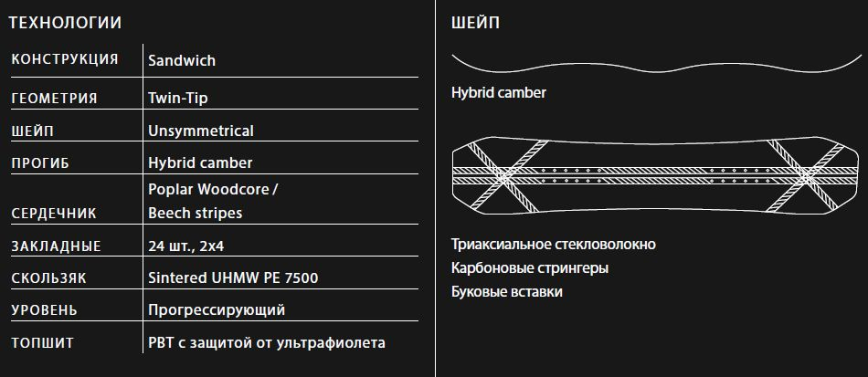 QuadAxial (четырехслойная). Стеклоткань размещена под углами 45/0/90/45, что обеспечивает доске максимальную жесткость и оптимальную передачу веса на кант. Этот материал преимущественно используется в сноубордах, предназначенных для жестких ботинок, и очень редко встречается в моделях для обычной обуви.
