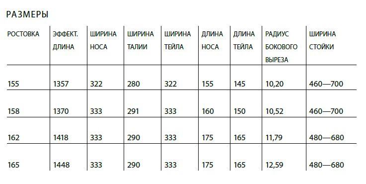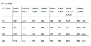 Геометрия определяется рядом характеристик: Ростовка - это длина доски от ее носа до хвоста. Как правило, соотношение веса райдера и рекомендуемой ростовки указано в таблицах описания моделей. Ширина носа и хвоста - это расстояние между самыми удаленными друг от друга точками, носа и хвоста, соответственно. Обычно эти два показателя определяют симметрию или асимметрию сноуборда. Ширина талии - это расстояния между ближайшими точками боковых поверхностей доски. Эффективная длина канта - это та часть канта доски, которая касается склона при движении и поворотах. Радиус бокового выреза - это радиус воображаемой окружности, часть которой проходит по боковой части канта доски.