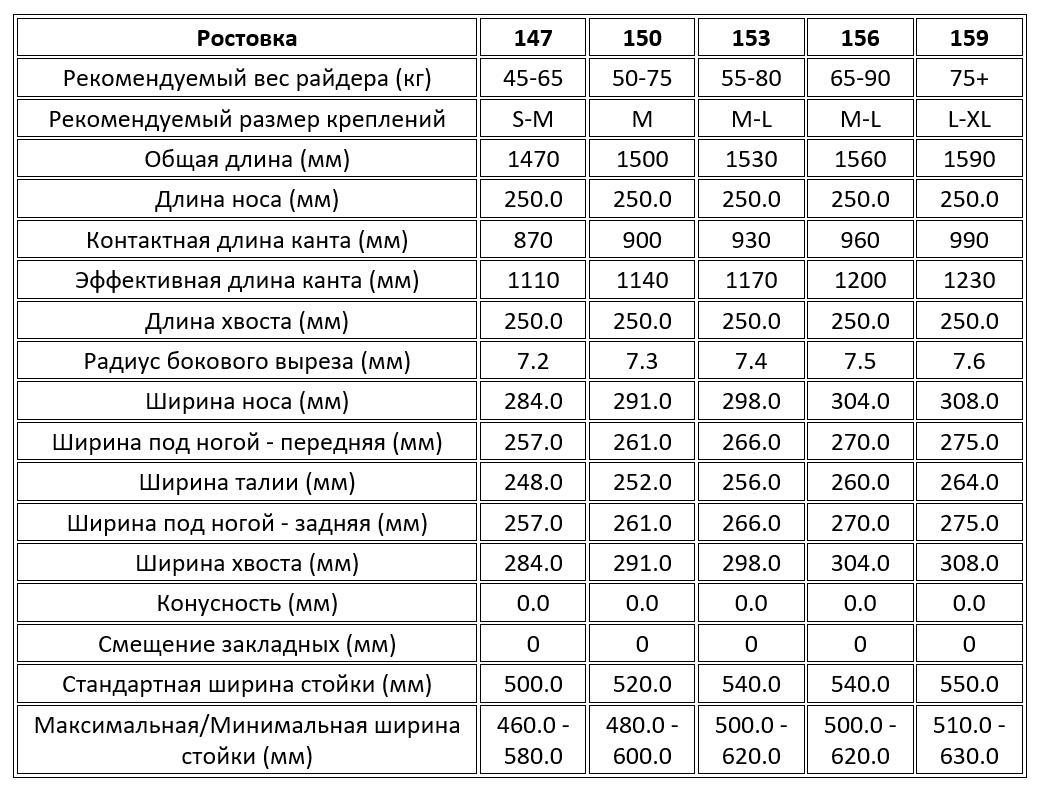 Геометрия определяется рядом характеристик: Ростовка - это длина доски от ее носа до хвоста. Как правило, соотношение веса райдера и рекомендуемой ростовки указано в таблицах описания моделей. Ширина носа и хвоста - это расстояние между самыми удаленными друг от друга точками, носа и хвоста, соответственно. Обычно эти два показателя определяют симметрию или асимметрию сноуборда. Ширина талии - это расстояния между ближайшими точками боковых поверхностей доски. Эффективная длина канта - это та часть канта доски, которая касается склона при движении и поворотах. Радиус бокового выреза - это радиус воображаемой окружности, часть которой проходит по боковой части канта доски.