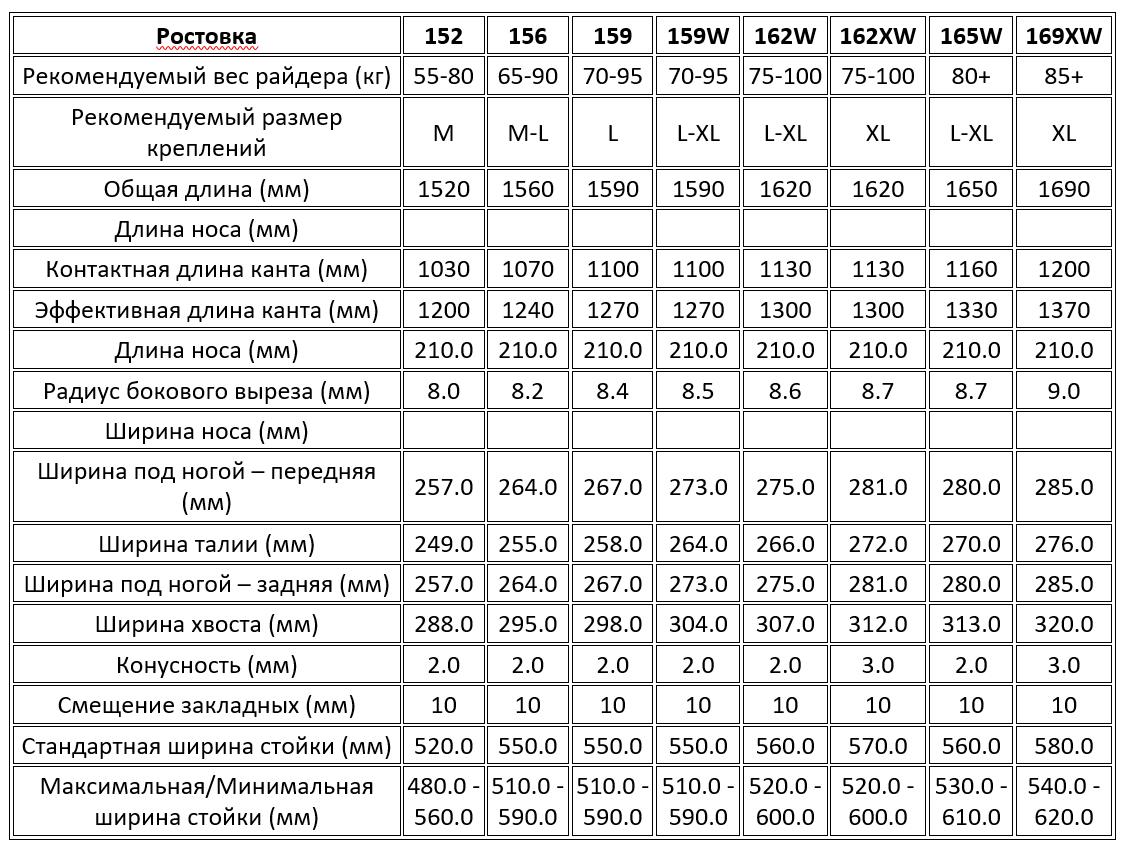 Геометрия определяется рядом характеристик: Ростовка - это длина доски от ее носа до хвоста. Как правило, соотношение веса райдера и рекомендуемой ростовки указано в таблицах описания моделей. Ширина носа и хвоста - это расстояние между самыми удаленными друг от друга точками, носа и хвоста, соответственно. Обычно эти два показателя определяют симметрию или асимметрию сноуборда. Ширина талии - это расстояния между ближайшими точками боковых поверхностей доски. Эффективная длина канта - это та часть канта доски, которая касается склона при движении и поворотах. Радиус бокового выреза - это радиус воображаемой окружности, часть которой проходит по боковой части канта доски.