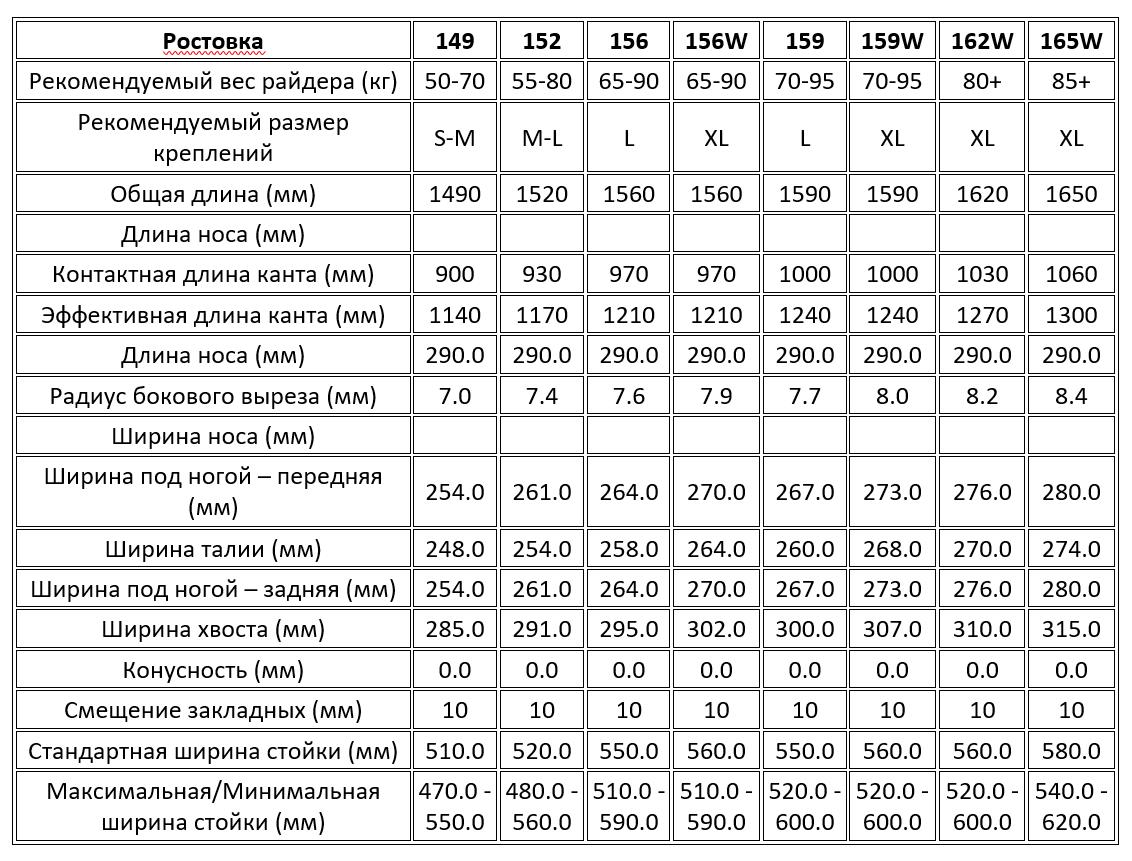 Геометрия определяется рядом характеристик: Ростовка - это длина доски от ее носа до хвоста. Как правило, соотношение веса райдера и рекомендуемой ростовки указано в таблицах описания моделей. Ширина носа и хвоста - это расстояние между самыми удаленными друг от друга точками, носа и хвоста, соответственно. Обычно эти два показателя определяют симметрию или асимметрию сноуборда. Ширина талии - это расстояния между ближайшими точками боковых поверхностей доски. Эффективная длина канта - это та часть канта доски, которая касается склона при движении и поворотах. Радиус бокового выреза - это радиус воображаемой окружности, часть которой проходит по боковой части канта доски.