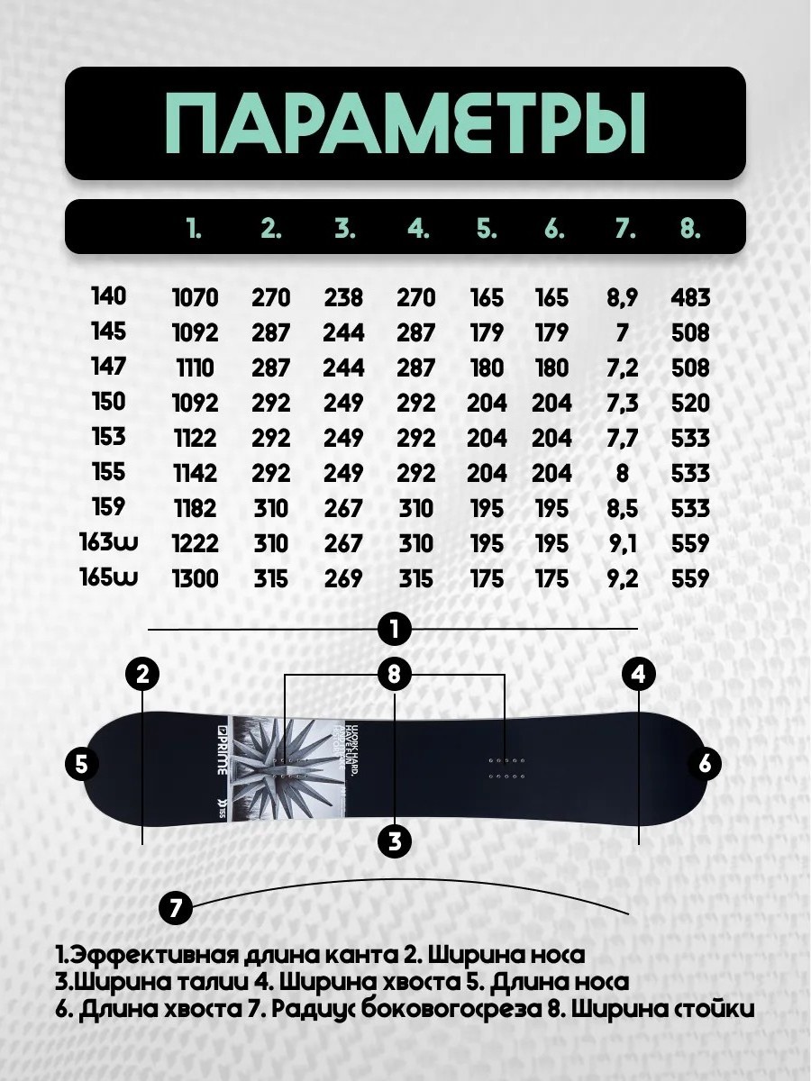 Геометрия определяется рядом характеристик: Ростовка - это длина доски от ее носа до хвоста. Как правило, соотношение веса райдера и рекомендуемой ростовки указано в таблицах описания моделей. Ширина носа и хвоста - это расстояние между самыми удаленными друг от друга точками, носа и хвоста, соответственно. Обычно эти два показателя определяют симметрию или асимметрию сноуборда. Ширина талии - это расстояния между ближайшими точками боковых поверхностей доски. Эффективная длина канта - это та часть канта доски, которая касается склона при движении и поворотах. Радиус бокового выреза - это радиус воображаемой окружности, часть которой проходит по боковой части канта доски.