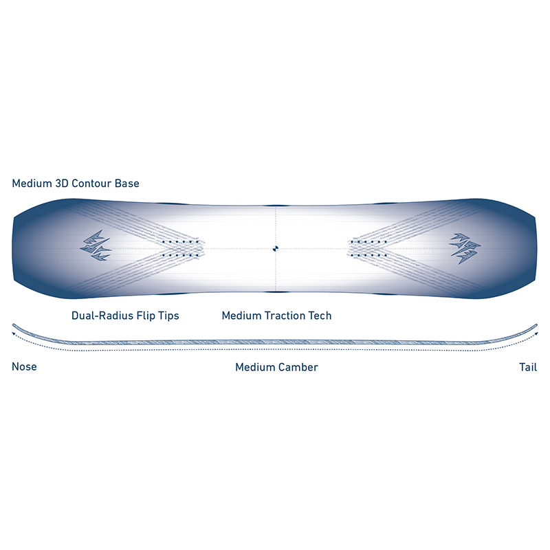 • Medium 3D Contour Base - профиль, который прекрасно подходит для фрирайда, обеспечивая отличные характеристики на снегу. В этой технологии канты в зоне носа и хвоста подняты на 7 мм, что улучшает маневренность и предотвращает зацепление в мягком снегу. Скругление начинается на уровне появления рокера, что позволяет сноуборду уверенно плавать в глубоком снегу.