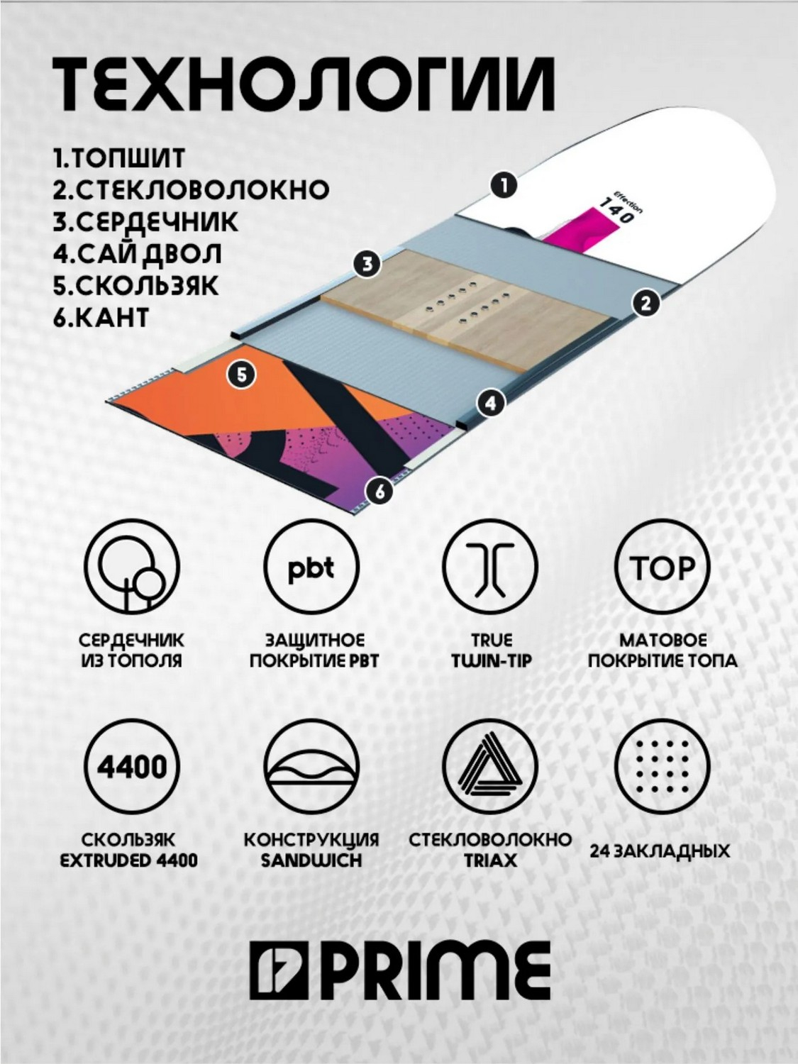 Доска Prime Effection - идеальный спутник для тех, кто только начинает покорять склоны или стремится уверенно выйти на новый уровень. Уже два сезона подряд эта универсальная модель завоёвывает симпатии райдеров благодаря продуманной геометрии, сбалансированной жёсткости (5/10) и фирменному прогибу CamRock, который обеспечивает отличную проходимость и цепкость на разных покрытиях и лёгкость в поворотах. Благодаря симметричной twin-tip конструкции она одинаково хорошо ведёт себя при катании в обе стороны, что бесуловно понравится любителям фристайла. Лёгкий сердечник из тополя снижает общий вес, а усиление триаксиальным стекловолокном добавляет упругости и отзывчивости. Экструдированный скользяк Extruded 4400 прост в обслуживании и надёжен в эксплуатации, а матовый топшит с UV-защитой сохраняет свой внешний вид даже после интенсивного использования.