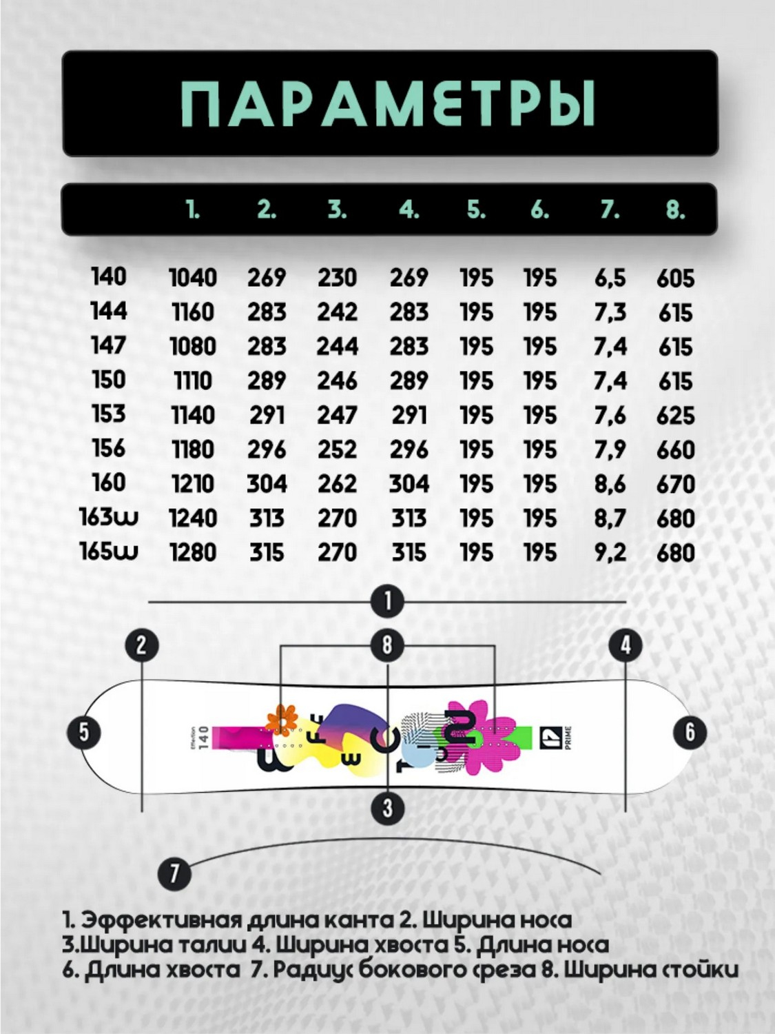 Геометрия определяется рядом характеристик: Ростовка - это длина доски от ее носа до хвоста. Как правило, соотношение веса райдера и рекомендуемой ростовки указано в таблицах описания моделей. Ширина носа и хвоста - это расстояние между самыми удаленными друг от друга точками, носа и хвоста, соответственно. Обычно эти два показателя определяют симметрию или асимметрию сноуборда. Ширина талии - это расстояния между ближайшими точками боковых поверхностей доски. Эффективная длина канта - это та часть канта доски, которая касается склона при движении и поворотах. Радиус бокового выреза - это радиус воображаемой окружности, часть которой проходит по боковой части канта доски.