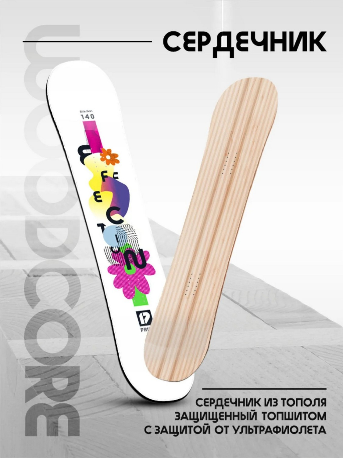 Традиционно его делают из дерева. Существует несколько видов деревянных сердечников. Реже всего встречающийся вид сердечника, «сплошной» (изготовленный из одного куска дерева), имеет один очень существенный недостаток - его может «повести винтом». Такие дешевые и легкие сердечники используют в сноубордах начального уровня. Дабы избежать винтового скручивания, чаще всего делают сердечник «с вертикальным ламинатом». Он состоит из продольных реек, склеенных между собой. Волокна в таком сердечнике противоположно направлены, именно для предотвращения «скручивания». Часто для сердечников используют рейки из разных пород дерева - как хвойных, так и лиственных.