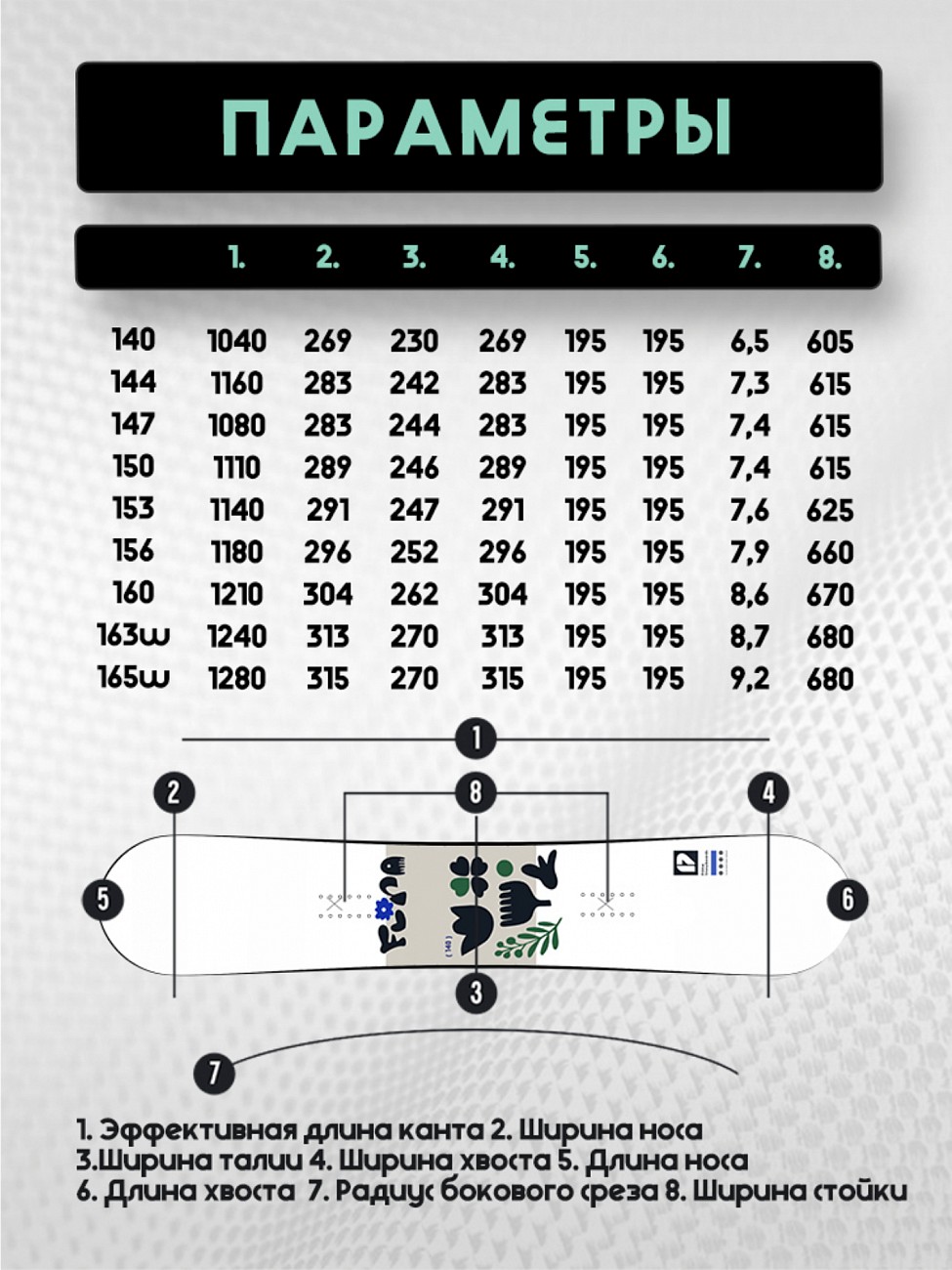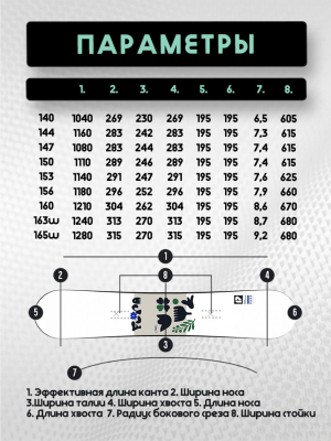 Геометрия определяется рядом характеристик: Ростовка - это длина доски от ее носа до хвоста. Как правило, соотношение веса райдера и рекомендуемой ростовки указано в таблицах описания моделей. Ширина носа и хвоста - это расстояние между самыми удаленными друг от друга точками, носа и хвоста, соответственно. Обычно эти два показателя определяют симметрию или асимметрию сноуборда. Ширина талии - это расстояния между ближайшими точками боковых поверхностей доски. Эффективная длина канта - это та часть канта доски, которая касается склона при движении и поворотах. Радиус бокового выреза - это радиус воображаемой окружности, часть которой проходит по боковой части канта доски.