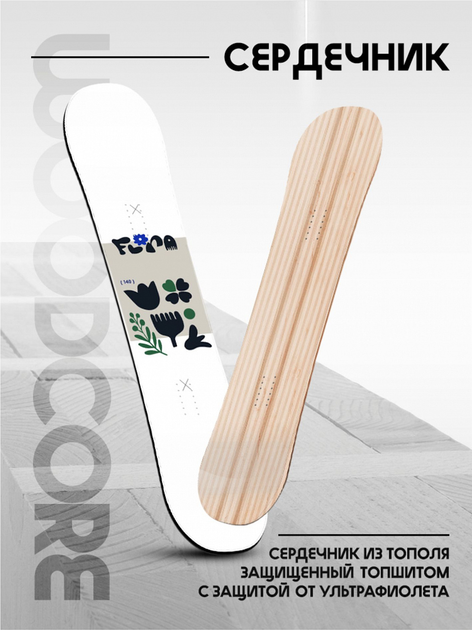 Традиционно его делают из дерева. Существует несколько видов деревянных сердечников. Реже всего встречающийся вид сердечника, «сплошной» (изготовленный из одного куска дерева), имеет один очень существенный недостаток - его может «повести винтом». Такие дешевые и легкие сердечники используют в сноубордах начального уровня. Дабы избежать винтового скручивания, чаще всего делают сердечник «с вертикальным ламинатом». Он состоит из продольных реек, склеенных между собой. Волокна в таком сердечнике противоположно направлены, именно для предотвращения «скручивания». Часто для сердечников используют рейки из разных пород дерева - как хвойных, так и лиственных.