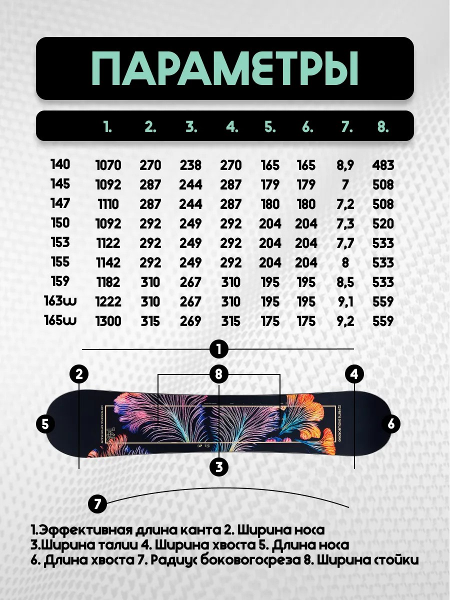Геометрия определяется рядом характеристик: Ростовка - это длина доски от ее носа до хвоста. Как правило, соотношение веса райдера и рекомендуемой ростовки указано в таблицах описания моделей. Ширина носа и хвоста - это расстояние между самыми удаленными друг от друга точками, носа и хвоста, соответственно. Обычно эти два показателя определяют симметрию или асимметрию сноуборда. Ширина талии - это расстояния между ближайшими точками боковых поверхностей доски. Эффективная длина канта - это та часть канта доски, которая касается склона при движении и поворотах. Радиус бокового выреза - это радиус воображаемой окружности, часть которой проходит по боковой части канта доски.