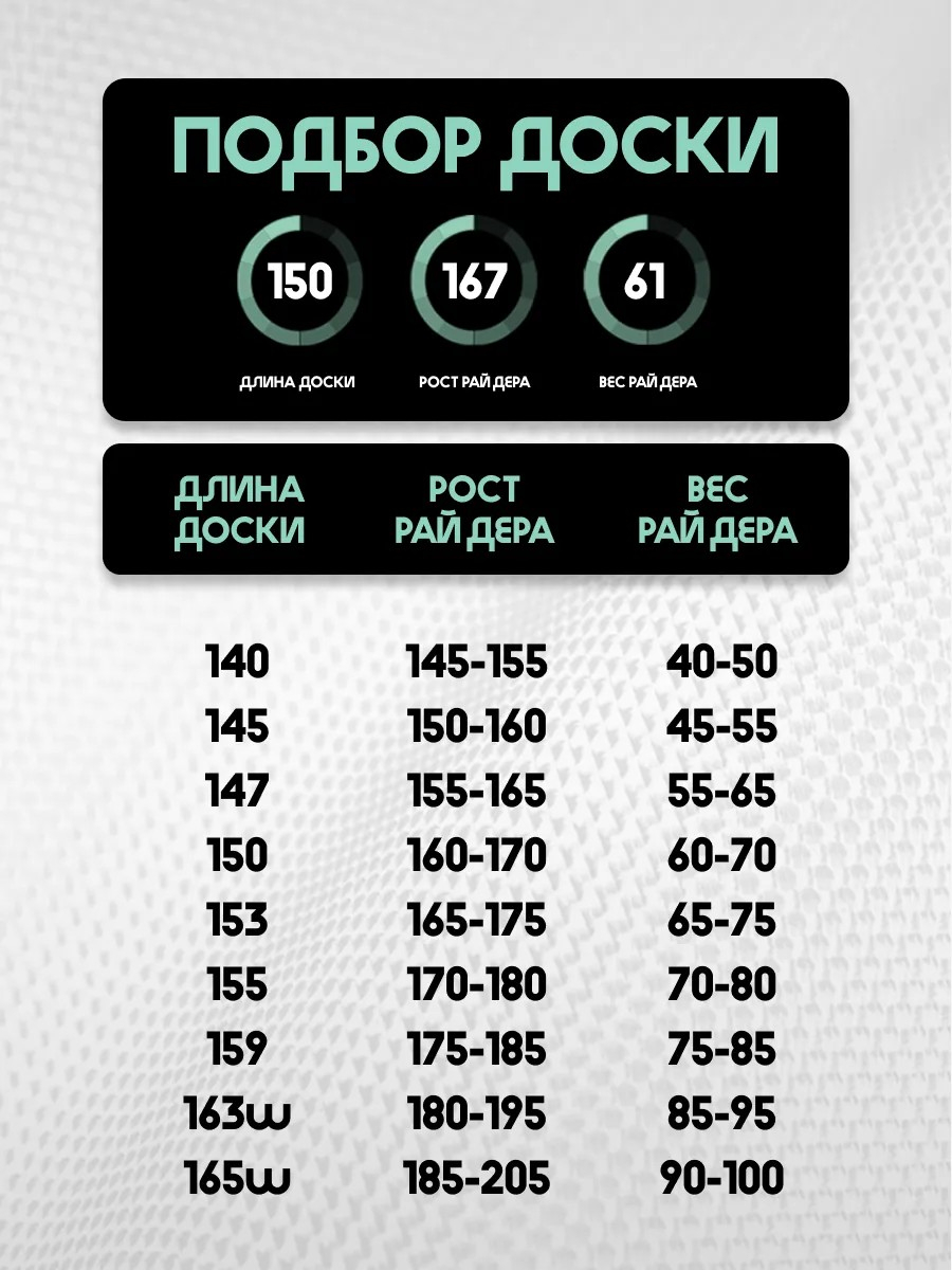 Классическая десятибальная шкала, по которой вы легко сможете определить жесткость конкретной доски. Мягкие доски входят в диапазон от 1 до 3, золотой серединой являются модели с уровнем от 4 до 6, жесткие борды начинаются с 7 и выше.