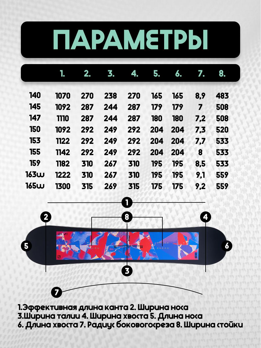 Геометрия определяется рядом характеристик: Ростовка - это длина доски от ее носа до хвоста. Как правило, соотношение веса райдера и рекомендуемой ростовки указано в таблицах описания моделей. Ширина носа и хвоста - это расстояние между самыми удаленными друг от друга точками, носа и хвоста, соответственно. Обычно эти два показателя определяют симметрию или асимметрию сноуборда. Ширина талии - это расстояния между ближайшими точками боковых поверхностей доски. Эффективная длина канта - это та часть канта доски, которая касается склона при движении и поворотах. Радиус бокового выреза - это радиус воображаемой окружности, часть которой проходит по боковой части канта доски.