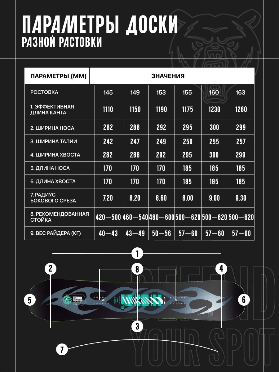 Геометрия определяется рядом характеристик: Ростовка - это длина доски от ее носа до хвоста. Как правило, соотношение веса райдера и рекомендуемой ростовки указано в таблицах описания моделей. Ширина носа и хвоста - это расстояние между самыми удаленными друг от друга точками, носа и хвоста, соответственно. Обычно эти два показателя определяют симметрию или асимметрию сноуборда. Ширина талии - это расстояния между ближайшими точками боковых поверхностей доски. Эффективная длина канта - это та часть канта доски, которая касается склона при движении и поворотах. Радиус бокового выреза - это радиус воображаемой окружности, часть которой проходит по боковой части канта доски.