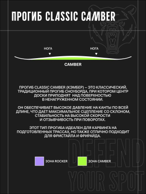 Классический Camber с изогнутой кверху центральной частью подойдет для универсального катания. Его также выделяют за щелчок, поэтому Camber подходит для прыжков с кикеров.