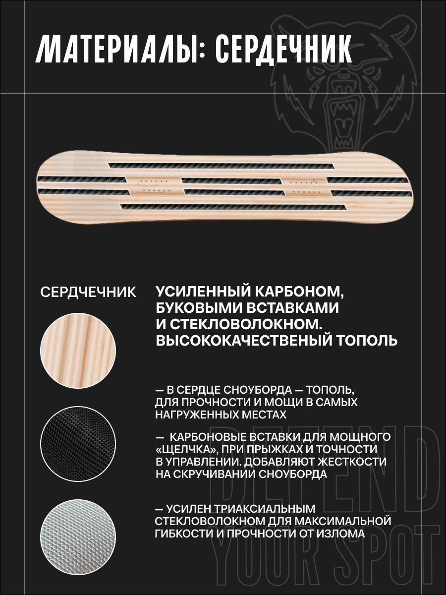 Каждый из этих материалов имеет свои уникальные характеристики, которые влияют на поведение сноуборда, позволяя производителям разрабатывать индивидуальные решения для разных условий катания и предпочтений райдеров.
