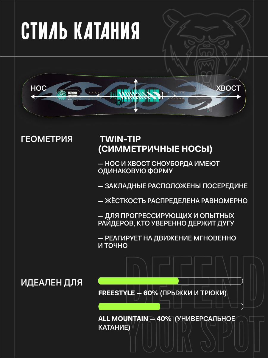 Сноуборд Terro Commander - это универсальный «рабочий конь» для прогрессирующих райдеров, созданный для катания без границ: от парковых рэйлов до целины за пределами трасс. Благодаря классическому камберу он обеспечивает отличное сцепление на жёстком снегу, чёткую отдачу при выходе из поворотов и уверенную езду на скорости. При этом жёсткость 5/10 делает доску достаточно прощающей для обучения новым трюкам. Особое внимание уделено конструкции: сердечник из высококачественного тополя с буковыми вставками сочетает лёгкость и упругость, а два карбоновых стрингера вместе с триаксиальным стекловолокном повышают торсионную жёсткость и отзывчивость. Инновационная геометрия кромок Cut Edges увеличивает контактную длину без изменения общей длины доски, улучшая контроль и стабильность. Спечённый скользяк Sintered UHMW PE 6000 гарантирует высокую скорость и долговечность, а прочный топшит с UV-защитой сохраняет внешний вид даже при интенсивной эксплуатации.