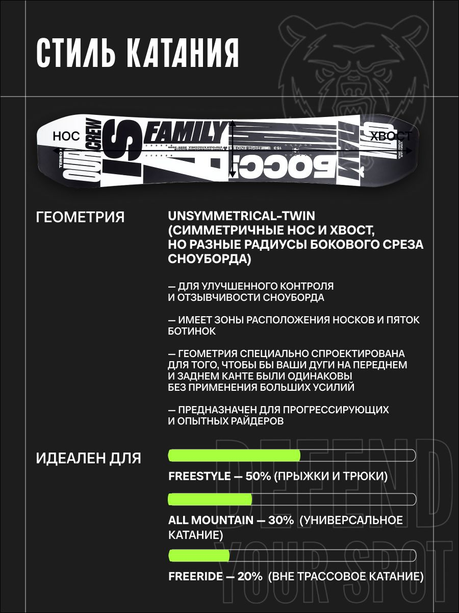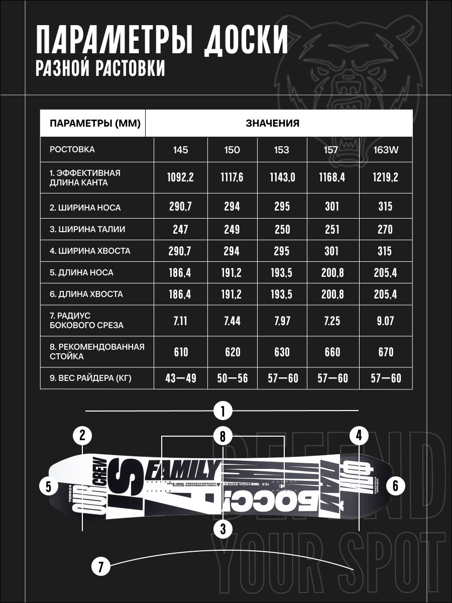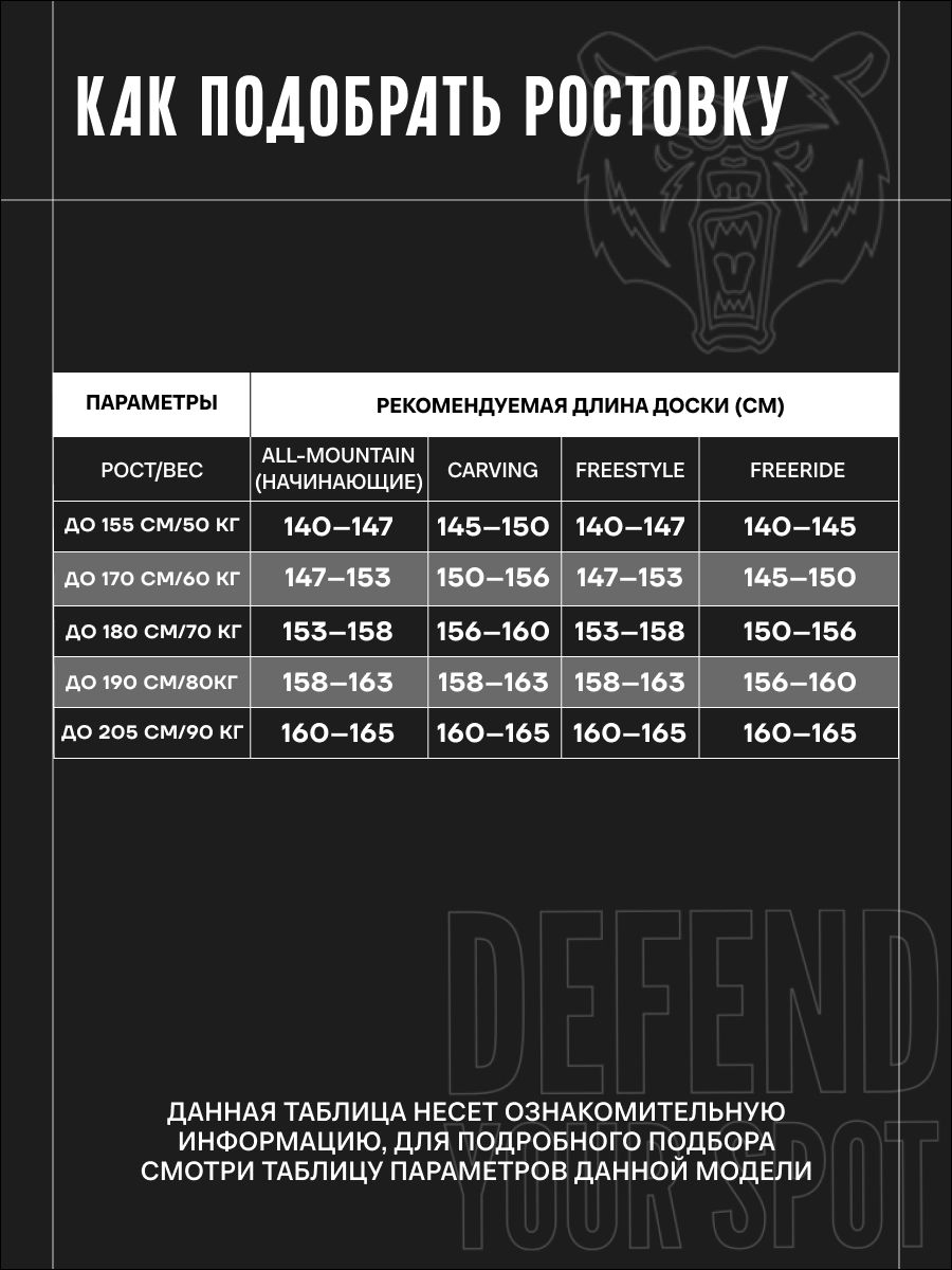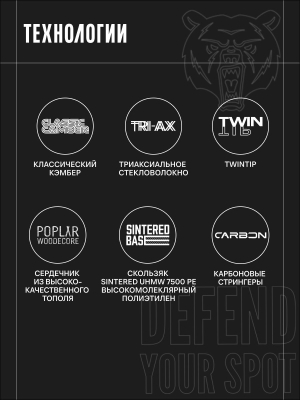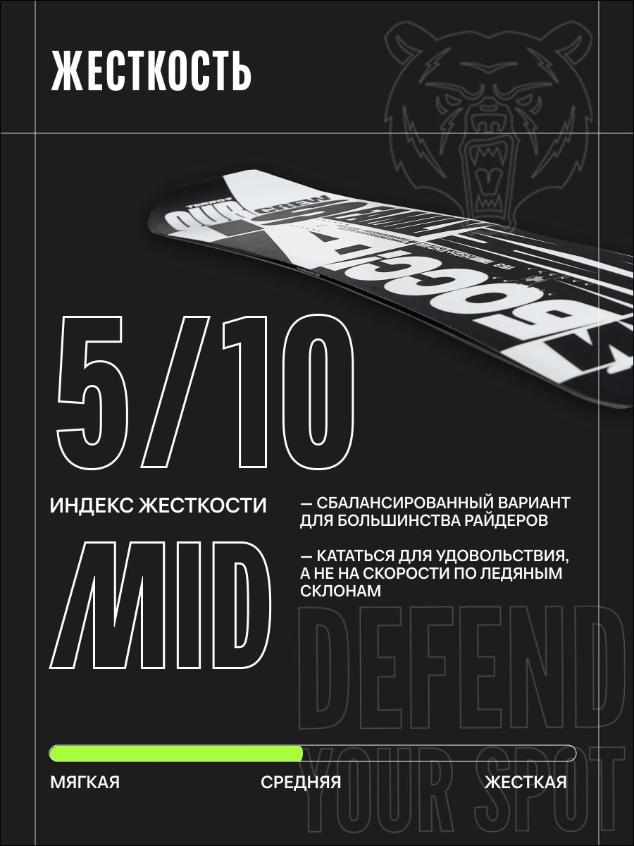 • Жёсткость: 6/10 - энергичная, но контролируемая, для прогрессирующих райдеров