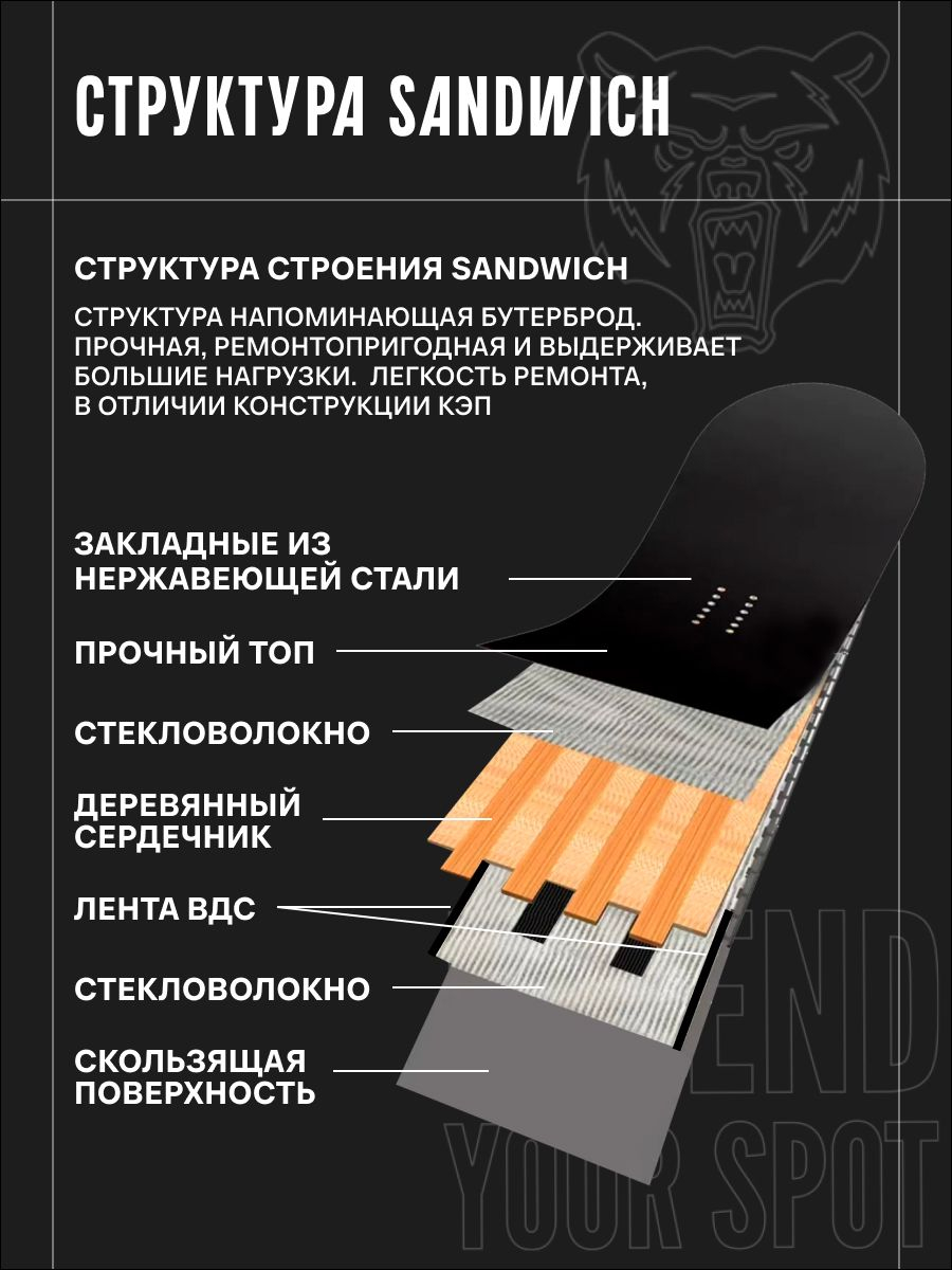 Вариантов ее множество, выделим три основных: «сэндвич», «кэп» и «гибридная сэндвич-кэповая» конструкция. Классический «сэндвич»: сердечник сверху и снизу оклеивают двумя плоскими слоями стеклоткани. Края сердечника в этом случае закрываются узкой полоской пластика ABS. Такая конструкция сноуборда проще ремонтируется и существенно лучше работает на предельных нагрузках.